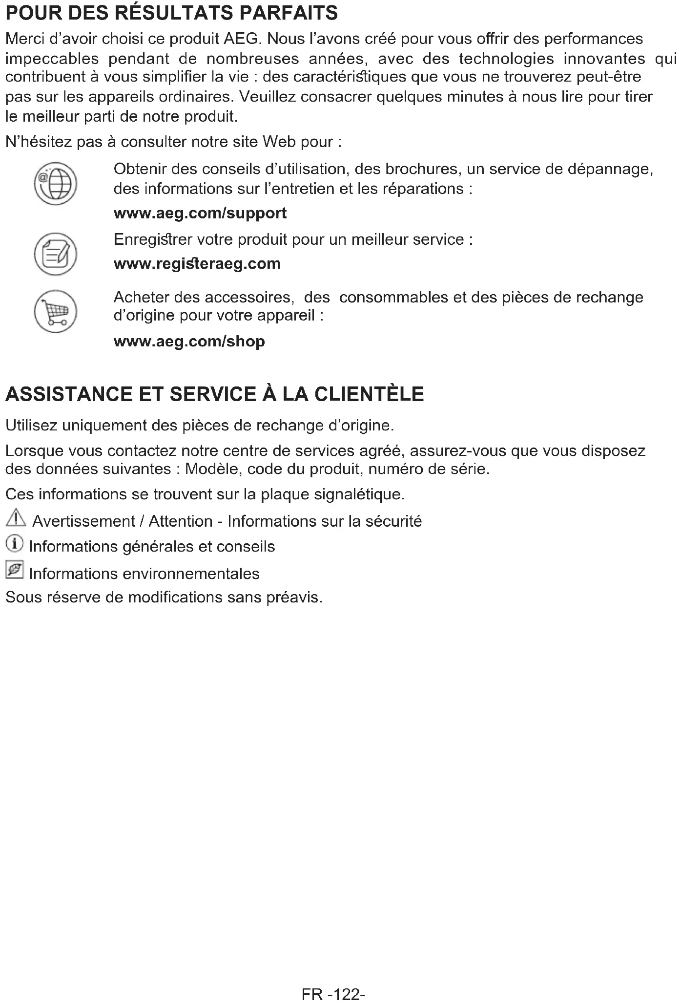 Merci d’avoir choisi ce produit AEG. Nous l’avons créé pour vous orir des performances impeccables pendant de nombreuses années, avec des technologies innovantes qui contribuent à vous simplier la vie : des caractériiques que vous ne trouverez peut-être pas sur les appareils ordinaires. Veuillez consacrer quelques minutes à nous lire pour tirer le meilleur parti de notre produit. N’hésitez pas à consulter notre site Web pour : Obtenir des conseils d’utilisation, des brochures, un service de dépannage, des informations sur l’entretien et les réparations : www.aeg.com/support Enregirer votre produit pour un meilleur service : www.regieraeg.com Acheter des accessoires, des consommables et des pièces de rechange d’origine pour votre appareil : www.aeg.com/shop