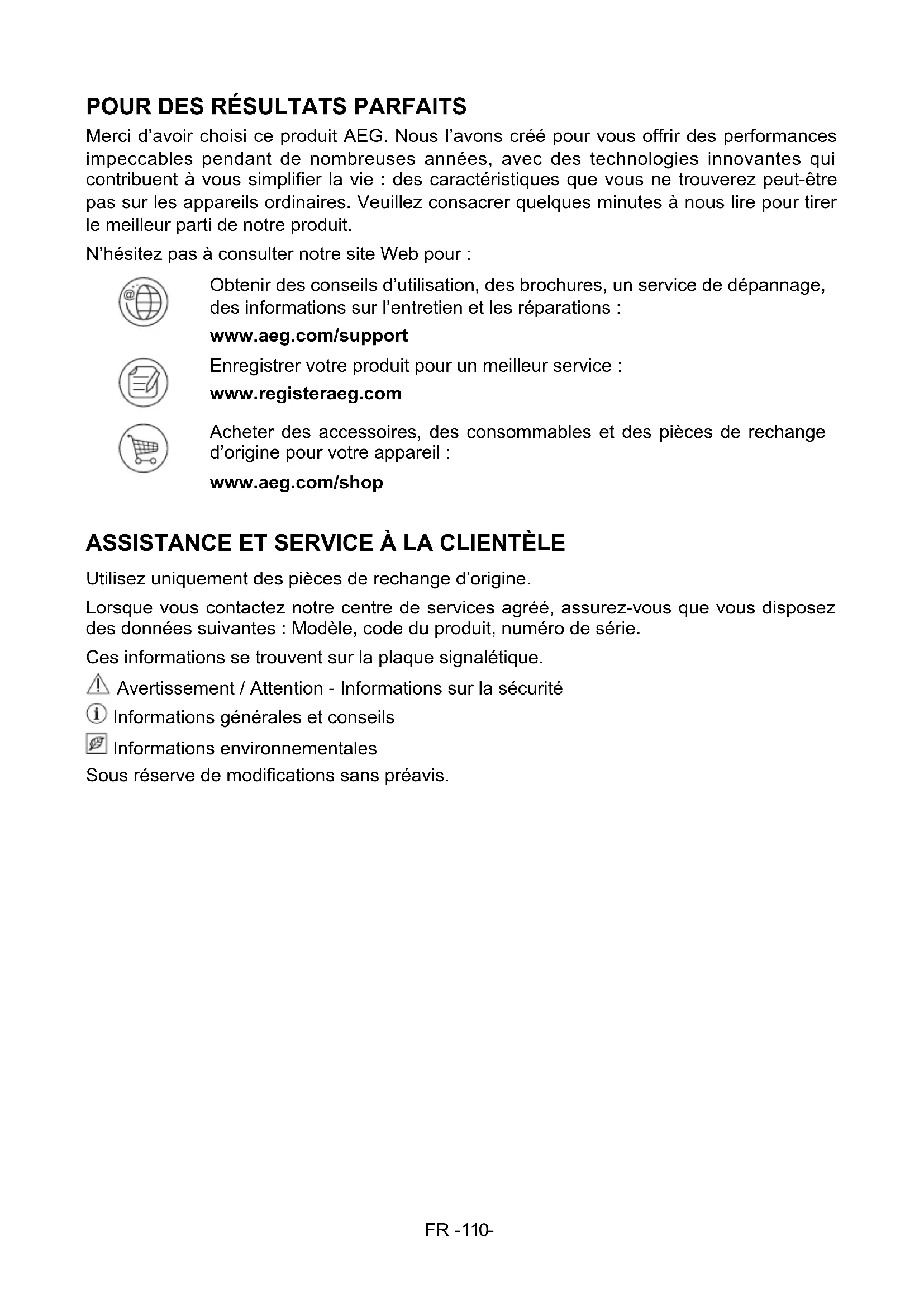 Merci d’avoir choisi ce produit AEG. Nous l’avons créé pour vous offrir des performances impeccables pendant de nombreuses années, avec des technologies innovantes qui contribuent à vous simplifier la vie : des caractéristiques que vous ne trouverez peut-être pas sur les appareils ordinaires. Veuillez consacrer quelques minutes à nous lire pour tirer le meilleur parti de notre produit. N’hésitez pas à consulter notre site Web pour : Obtenir des conseils d’utilisation, des brochures, un service de dépannage, des informations sur l’entretien et les réparations : www.aeg.com/support Enregistrer votre produit pour un meilleur service : www.registeraeg.com Acheter des accessoires, des consommables et des pièces de rechange d’origine pour votre appareil : www.aeg.com/shop