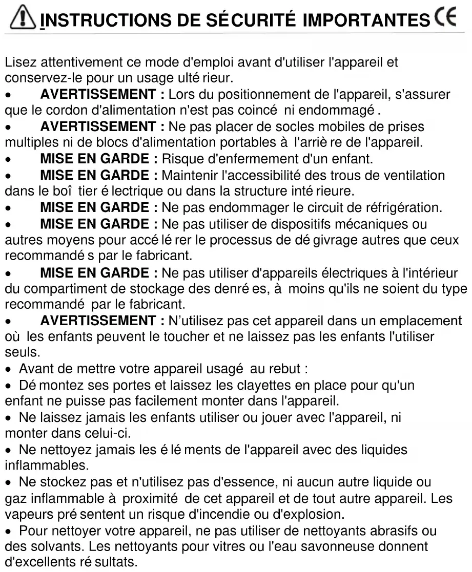 - MISE EN GARDE : Ne pas utiliser de dispositifs mécaniques ou autres moyens pour accélérer le processus de dégivrage autres que ceux recommandés par le fabricant.