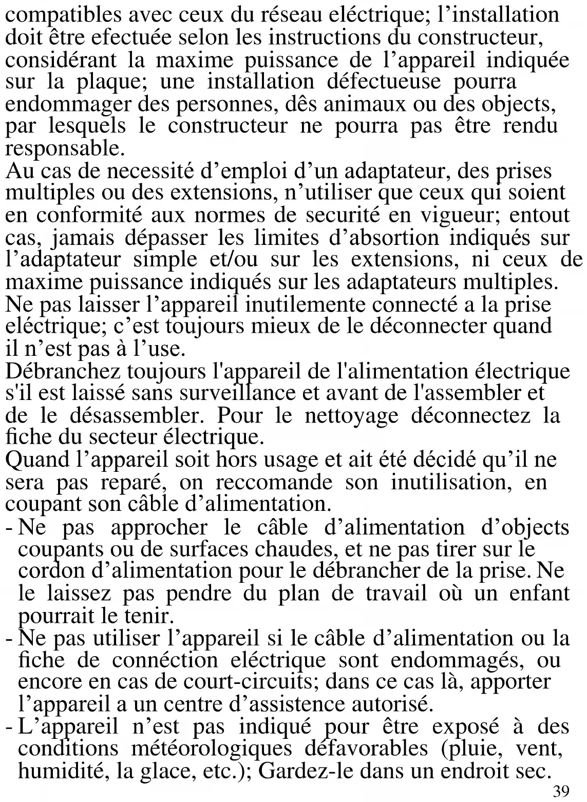 FRANCAIS: ADVERTISSEMENT Les indications suivantes sont très importantes en ce qui concerne l’installation, usage et manutention de cet appareil; gardez soigneusement ce manuel pour des futures consultations; n’utilisez pas l’appareil que selon les indications de ce manuel d’instructions; n’importe quel autre type d’ utilisation devra être consideré inaproprié et potentiellement dangereux; pour cette raison le constructeur ne pourra pas être rendu responsable si des dommages résultants de l’utilisation inapropriée ou irresponsable de l’appareil se produisent. Avant de l’utilisation, certifiez-vous de l’integrité de l’appareil; en cas de doute ne l’utilisez pas et addressez- vous a l’assistence téchnique autoriséa; ne laissez pas des parties de l’emballage (sacs de plastique, polystirène, ongles, agrafages, etc.) à la portée des enfants, car elles constituent des potentielles sources de danger; en autre, il faut rappeler que ces parties doivent être objet de collècte differencié de résidus. Certifiez-vous que les donnés constants de la plaque sont39 compatibles avec ceux du réseau eléctrique; l’installation doit être efectuée selon les instructions du constructeur, considérant la maxime puissance de l’appareil indiquée sur la plaque; une installation défectueuse pourra endommager des personnes, dês animaux ou des objects, par lesquels le constructeur ne pourra pas être rendu responsable. Au cas de necessité d’emploi d’un adaptateur, des prises multiples ou des extensions, n’utiliser que ceux qui soient en conformité aux normes de securité en vigueur; entout cas, jamais dépasser les limites d’absortion indiqués sur l’adaptateur simple et/ou sur les extensions, ni ceux de maxime puissance indiqués sur les adaptateurs multiples. Ne pas laisser l’appareil inutilemente connecté a la prise eléctrique; c’est toujours mieux de le déconnecter quand il n’est pas à l’use. Débranchez toujours l'appareil de l'alimentation électrique s'il est laissé sans surveillance et avant de l'assembler et de le désassembler. Pour le nettoyage déconnectez la fiche du secteur électrique. Quand l’appareil soit hors usage et ait été décidé qu’il ne sera pas reparé, on reccomande son inutilisation, en coupant son câble d’alimentation. - Ne pas approcher le câble d’alimentation d’objects coupants ou de surfaces chaudes, et ne pas tirer sur le cordon d’alimentation pour le débrancher de la prise. Ne le laissez pas pendre du plan de travail où un enfant pourrait le tenir. - Ne pas utiliser l’appareil si le câble d’alimentation ou la fiche de connéction eléctrique sont endommagés, ou encore en cas de court-circuits; dans ce cas là, apporter l’appareil a un centre d’assistence autorisé. - L’appareil n’est pas indiqué pour être exposé à des conditions météorologiques défavorables (pluie, vent, humidité, la glace, etc.); Gardez-le dans un endroit sec.40 Jamais opérer ou même toucher l’appareil avec les mains mouillées ou les pieds nus. - Les enfants ne doivent pas jouer avec cet appareil. - Cet appareil peut être utilisé par des enfants agés de plus de 8 ans et par des personnes avec une réduite capacité phisique, sensorial ou mental, ou encore avec peu d’expérience à son usage, pourvu qu’une supervision adéquate leur en soit assuré, ou s’ils auraient été instruits à l’usage de l’appareil en complete securité. Les opérations de nettoyage e de manutention ne oivent pás être efectués par des enfants, sauf pour ceux qui sont agés de plus de 8 ans et sont supervisionés. - Gardez l’appareil et le câble d’alimentation hors la portée des enfants agés de moins de 8 ans. - L’appareil est pour l’usage domestique et intérieur. Au cas de panne et/ou de mauvais fonctionnement, ne pas intervenir sur l’ appareil. Pour une éventuel réparation s’addresser uniquement a un centre autorisé par le constructeur, en demandant dês pièces de remplacement originaux. Le non respect de ces indications peut compromettre la securité de l’appareil e rendre invalides les termes de la garantie. ATTENTION: Cet appareil comporte une fonction de chauffage. Quelques surfaces, même si non la plaque elle même, pourront atteindre des températures élevées. Étant donné que la sensibilité à la température diffère de personne à personne, cet appareil devrà être usé avec PRUDENCE. Placez l’appareil sur des surfaces adéhrentes et préparées pour cet effet, et utilisez les mésures de protection contre la chaleur conseillées, comme dês poignées ou des gants de cuisine. - Cet appareil est destiné à être utilisé dans les ménages et des applications similaires: les cuisines du personnel dans les magasins, bureaux et autres environnements de travail, pour les clients dans les hôtels, motels et autres41 environnements de type résidentiel, de type lit et petit- déjeuner, hébergement. - N’utiliser que des accéssoires e pièces d’origine. - Avant chaque utilisation, effectuez le cordon d'alimentation. Ne soumettez pas le produit à des chocs susceptibles de l'endommager. - L’appareil n’est pas conçu pour être utilisé avec une minuterie extérieure ou un commande à distance. - Avant chaque utilisation, effectuez le cordon d'alimentation. Ne soumettez pas le produit à des chocs susceptibles de l'endommager. - Tenir l’appareil à l’écart des environnements où il peut y avoir des gaz, vapeurs, des substances inflammables ou explosives.