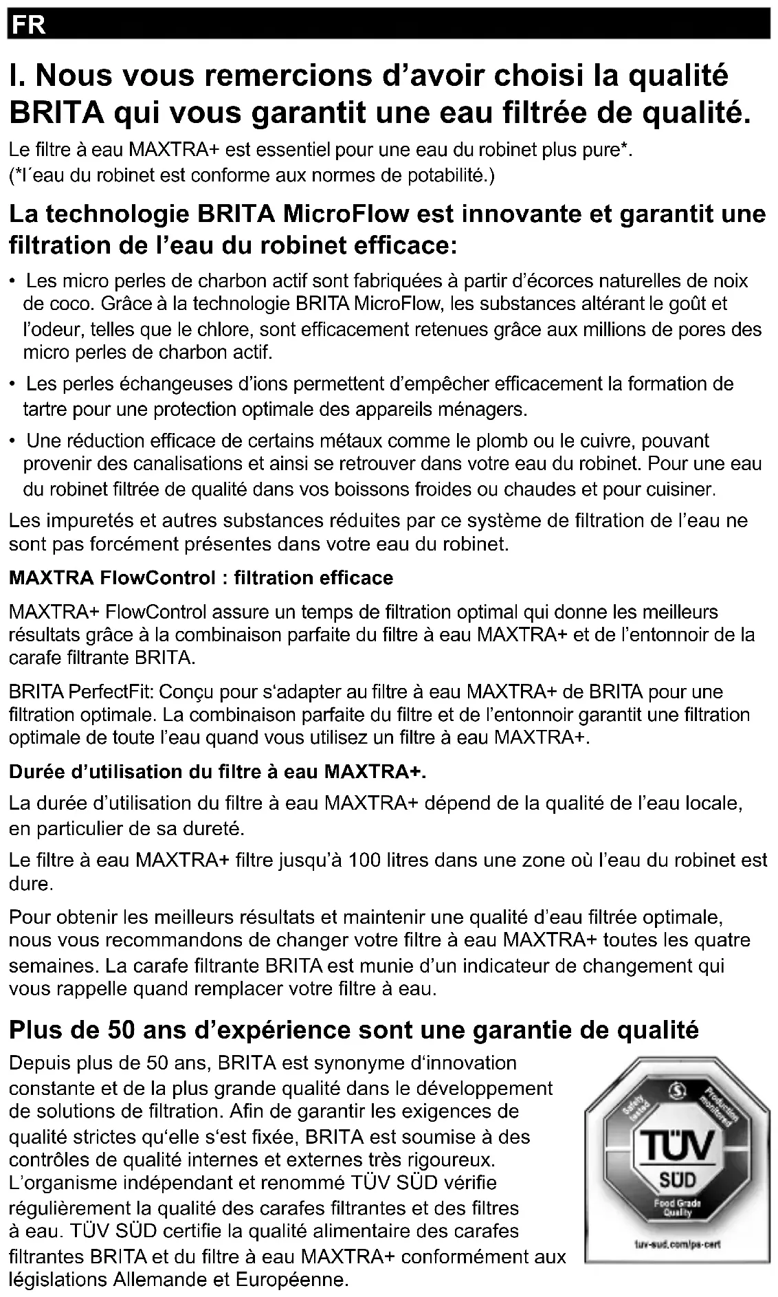- Une réduction efcace de certains métaux comme le plomb ou le cuivre, pouvant provenir des canalisations et ainsi se retrouver dans votre eau du robinet. Pour une eau du robinet ltrée de qualité dans vos boissons froides ou chaudes et pour cuisiner. Les impuretés et autres substances réduites par ce système de ltration de l’eau ne sont pas forcément présentes dans votre eau du robinet. MAXTRA FlowControl : ltration efcace MAXTRA+ FlowControl assure un temps de ltration optimal qui donne les meilleurs résultats grâce à la combinaison parfaite du ltre à eau MAXTRA+ et de l’entonnoir de la carafe ltrante BRITA. BRITA PerfectFit: Conçu pour s‘adapter au ltre à eau MAXTRA+ de BRITA pour une ltration optimale. La combinaison parfaite du ltre et de l’entonnoir garantit une ltration optimale de toute l’eau quand vous utilisez un ltre à eau MAXTRA+. Durée d’utilisation du ltre à eau MAXTRA+. La durée d’utilisation du ltre à eau MAXTRA+ dépend de la qualité de l’eau locale, en particulier de sa dureté. Le ltre à eau MAXTRA+ ltre jusqu’à 100 litres dans une zone où l’eau du robinet est dure. Pour obtenir les meilleurs résultats et maintenir une qualité d’eau ltrée optimale, nous vous recommandons de changer votre ltre à eau MAXTRA+ toutes les quatre semaines. La carafe ltrante BRITA est munie d’un indicateur de changement qui vous rappelle quand remplacer votre ltre à eau. Plus de 50 ans d’expérience sont une garantie de qualité Depuis plus de 50 ans, BRITA est synonyme d‘innovation constante et de la plus grande qualité dans le développement de solutions de ltration. An de garantir les exigences de qualité strictes qu‘elle s‘est xée, BRITA est soumise à des contrôles de qualité internes et externes très rigoureux. L’organisme indépendant et renommé TÜV SÜD vérie régulièrement la qualité des carafes ltrantes et des ltres à eau. TÜV SÜD certie la qualité alimentaire des carafes ltrantes BRITA et du ltre à eau MAXTRA+ conformément aux législations Allemande et Européenne.Satisfait ou remboursé : la garantie BRITA BRITA est convaincue que son produit répondra à toutes vos attentes en termes de qualité et de performance. Si toutefois vous n’étiez pas entièrement satisfait de ce produit, BRITA vous le rembourse dans un délai de 30 jours à compter de la date d’achat. Renvoyez la carafe ltrante avec votre preuve d’achat datée, la raison du renvoi, votre nom, votre numéro de téléphone et vos informations bancaires au service consommateur BRITA du pays où vous avez acheté la carafe ltrante. Vous trouverez l’adresse correspondante à la n de ce manuel. Recyclage BRITA: par respect pour l’environnement Les ltres à eau MAXTRA+ usagés sont recyclables. BRITA met en œuvre un programme de collecte et de recyclage complet. An de limiter l’impact de ses produits sur l’environnement, BRITA réutilise ou recycle intégralement toutes les matières premières.D’autres informations sont disponibles sur www.BRITA.fr ou en contactant le service consommateurs de BRITA. Vous trouverez l’adresse correspondante à la n du manuel.