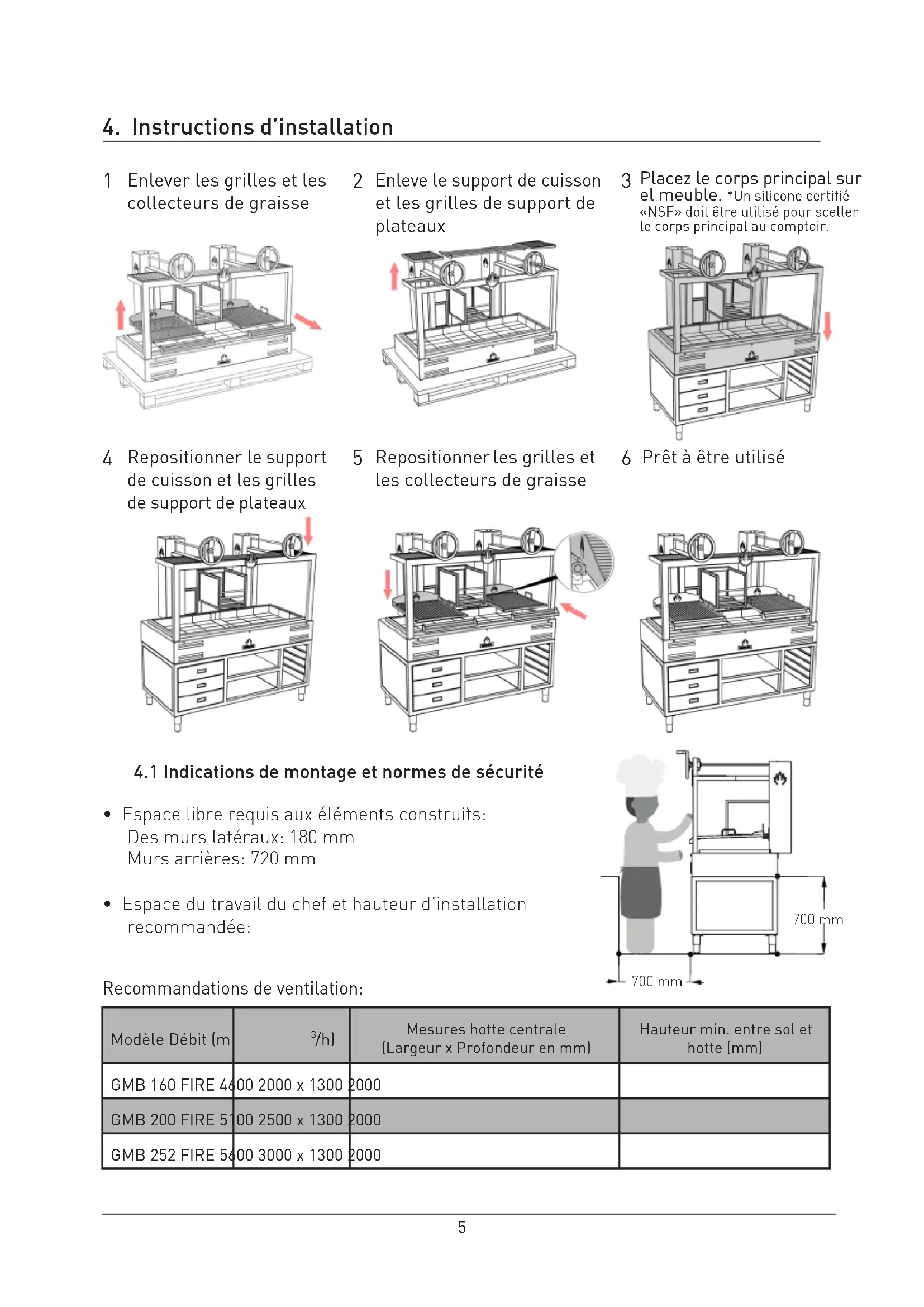 /h) Mesures hotte centrale (Largeur x Profondeur en mm) Hauteur min. entre sol et hotte (mm) GMB 160 FIRE 4600 2000 x 1300 2000 GMB 200 FIRE 5100 2500 x 1300 2000 GMB 252 FIRE 5600 3000 x 1300 2000 Enleve le support de cuisson et les grilles de support de plateaux