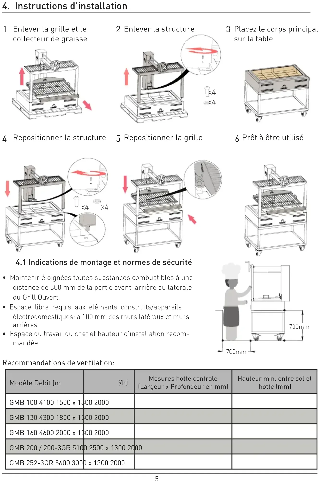 Enlever la grille et le collecteur de graisse 700mm700mm Recommandations de ventilation: