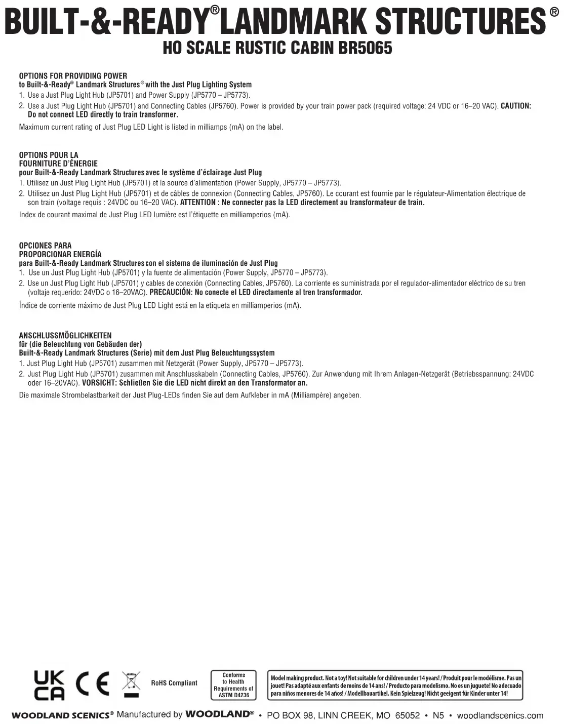 2. Utilisez un Just Plug Light Hub (JP5701) et de câbles de connexion (Connecting Cables, JP5760). Le courant est fournie par le régulateur-Alimentation électrique de son train (voltage requis : 24VDC ou 16–20 VAC). ATTENTION : Ne connecter pas la LED directement au transformateur de train. Index de courant maximal de Just Plug LED lumière est l’étiquette en milliamperios (mA).OPCIONES PARAPROPORCIONAR ENERGÍApara Built-&-Ready Landmark Structures con el sistema de iluminación de Just Plug