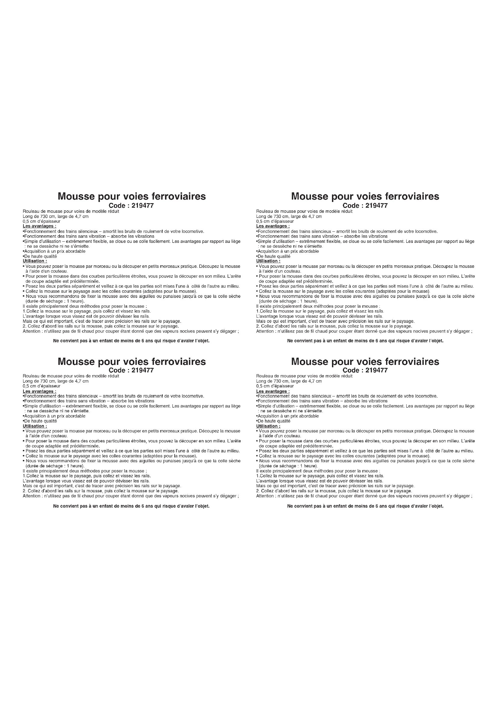 Attention : n’utilisez pas de fil chaud pour couper étant donné que des vapeurs nocives peuvent s’y dégager ; Ne convient pas à un enfant de moins de 6 ans qui risque d’avaler l’objet. Mousse pour voies ferroviaires Code : 219477 Rouleau de mousse pour voies de modèle réduit Long de 730 cm, large de 4,7 cm 0,5 cm d’épaisseur Les avantages :