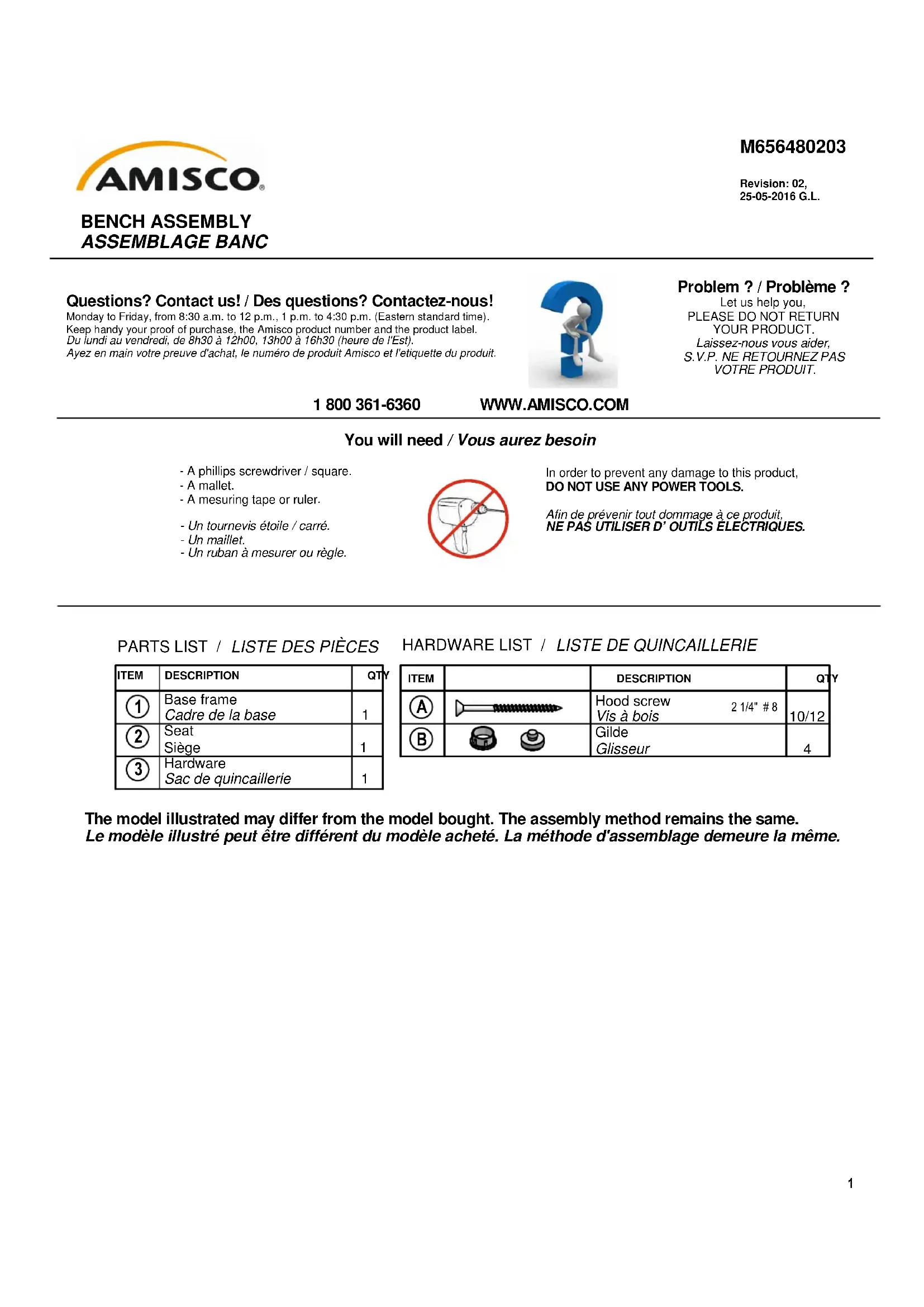 - Un tournevis étoile / carré. - Un maillet. - Un ruban à mesurer ou règle. Questions? Contact us! / Des questions? Contactez-nous! Monday to Friday, from 8:30 a.m. to 12 p.m., 1 p.m. to 4:30 p.m. (Eastern standard time). Keep handy your proof of purchase, the Amisco product number and the product label. Du lundi au vendredi, de 8h30 à 12h00, 13h00 à 16h30 (heure de l'Est).Ayez en main votre preuve d'achat, le numéro de produit Amisco et l'etiquette du produit.
