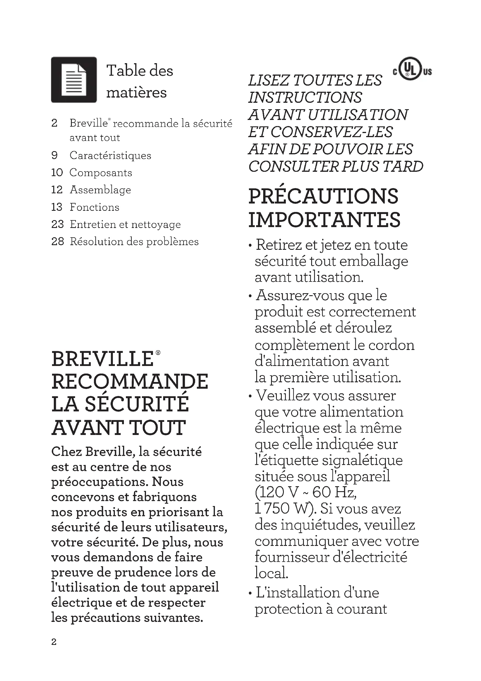 AVANT TOUT Chez Breville, la sécurité est au centre de nos préoccupations. Nous concevons et fabriquons nos produits en priorisant la sécurité de leurs utilisateurs, votre sécurité. De plus, nous vous demandons de faire preuve de prudence lors de l'utilisation de tout appareil électrique et de respecter les précautions suivantes.