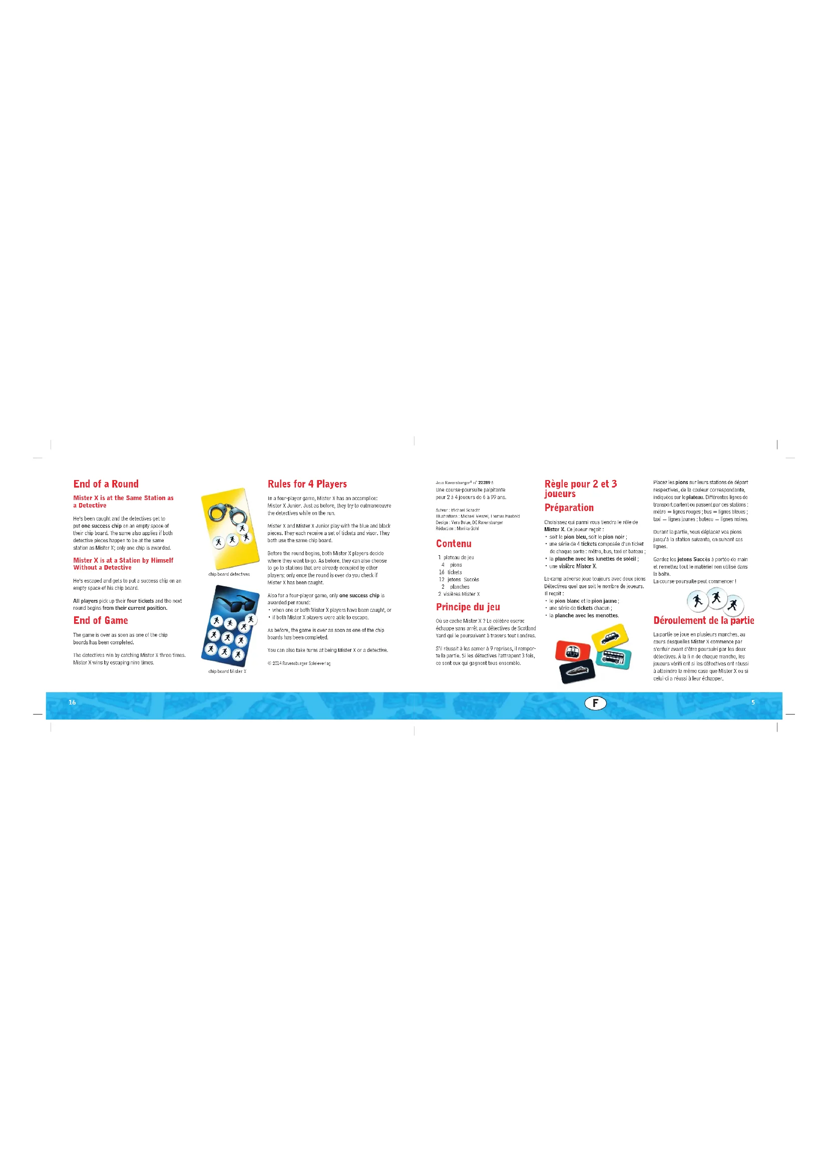 Auteur : Michael SchachtIllustrations : Michael Menzel, Thomas HauboldDesign : Vera Bolze, DE RavensburgerRédaction : Monika Gohl Déroulement de la partie La partie se joue en plusieurs manches, au cours desquelles Mister X commence par s’enfuir avant d’être poursuivi par les deux détectives. À la fi n de chaque manche, les joueurs vérifi ent si les détectives ont réussi à atteindre la même case que Mister X ou si celui-ci a réussi à leur échapper. Placez les pions sur leurs stations de départ respectives, de la couleur correspondante, indiquées sur le plateau. Différentes lignes de transport partent ou passent par ces stations : métro = lignes rouges ; bus = lignes bleues ; taxi = lignes jaunes ; bateau = lignes noires. Durant la partie, vous déplacez vos pions jusqu’à la station suivante, en suivant ces lignes. Gardez les jetons Succès à portée de main et remettez tout le matériel non utilisé dans la boîte. La course-poursuite peut commencer !