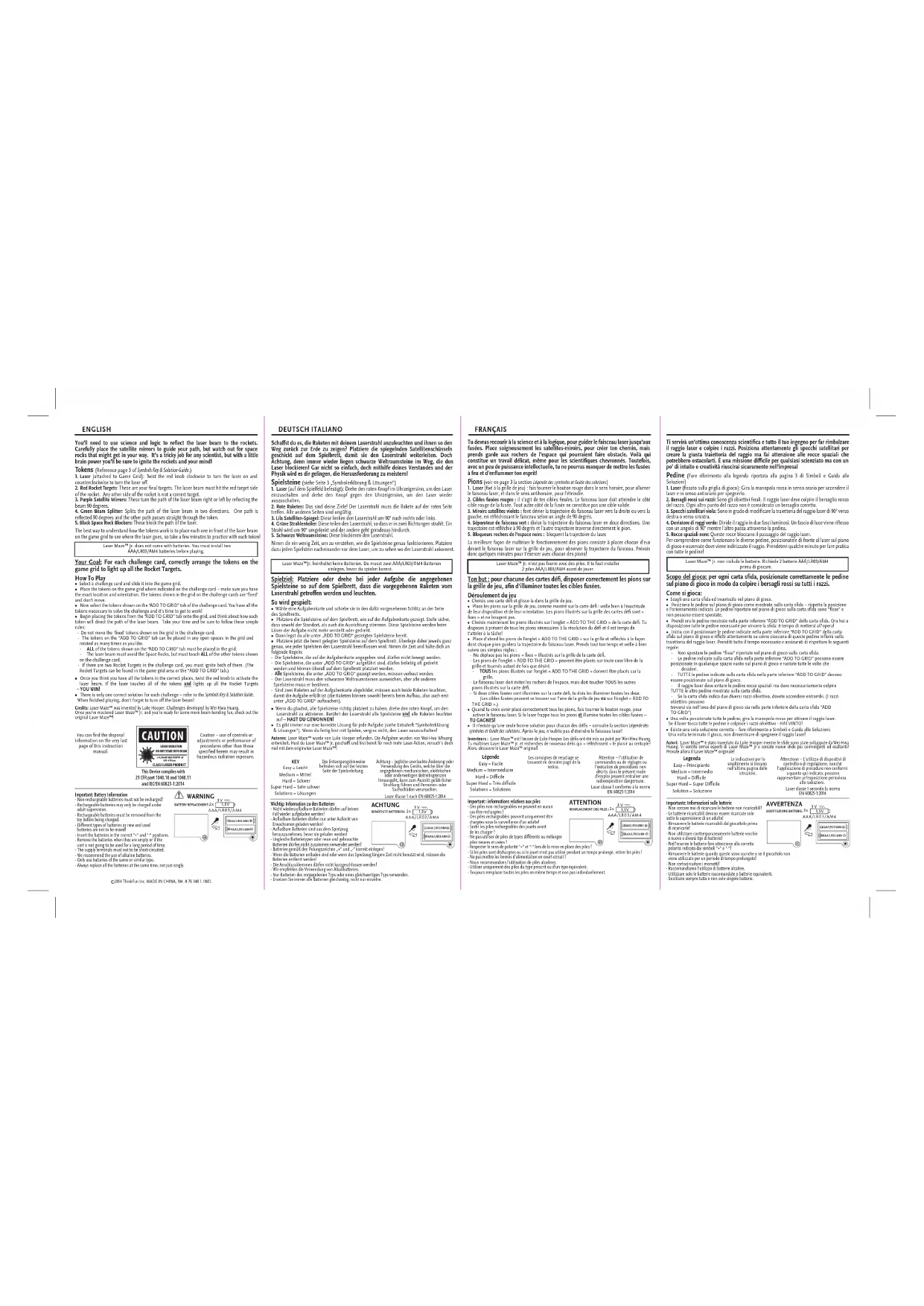 - Il n’existe qu’une seule bonne solution pour chacun des dés – consulte la section Légende des symboles et Guide des solutions. Après le jeu, n’oublie pas d’éteindre le faisceau laser! Inventeurs: Laser Maze™ est l’œuvre de Luke Hooper. Les dés ont été mis au point par Wei-Hwa Huang. Tu maîtrises Laser Maze™ Jr. et recherches de nouveaux dés qui «rééchissent» le plaisir au centuple? Alors, découvre le Laser Maze™ original! ENGLISH DEUTSCH ITALIANO FRANÇAIS Wichtig: Information zu den Batterien- Nicht wiederauadbare Batterien dürfen auf keinen Fall wieder aufgeladen werden!- Auadbare Batterien dürfen nur unter Aufsicht von Erwachsenen geladen werden!- Auadbare Batterien sind aus dem Spielzeug herauszunehmen, bevor sie geladen werden!- Ungleiche Batterietypen oder neue und gebrauchte Batterien dürfen nicht zusammen verwendet werden!- Batterien gemäß den Polungszeichen „+" und „-" korrekt einlegen!- Wenn die Batterien entladen sind oder wenn das Spielzeug längere Zeit nicht benutzt wird, müssen die Batterien entfernt werden!- Die Anschlussklemmen dürfen nicht kurzgeschlossen werden!- Wir empfehlen die Verwendung von Alkalibatterien.- Nur Batterien des vorgegebenen Typs oder eines gleichwertigen Typs verwenden.- Ersetzen Sie immer alle Batterien gleichzeitig, nicht nur einzelne. ACHTUNG BENÖTIGTE BATTERIEN: 3 V