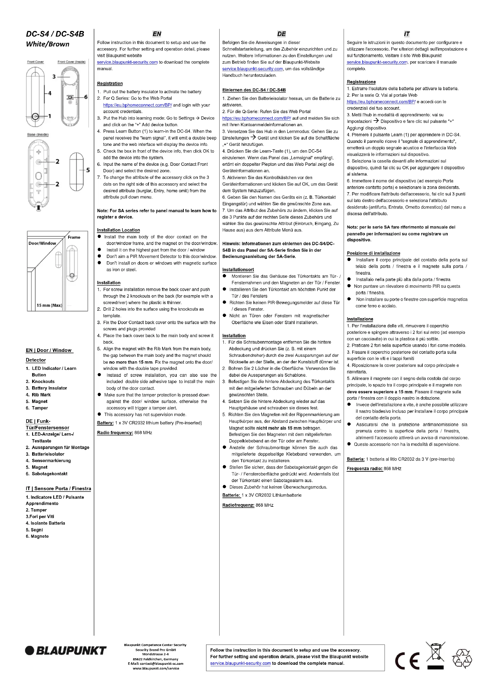 Suivez les instructions de ce document pour configurer et utiliser le détecteur. Pour plus de détails sur les réglages et le fonctionnement, visitez le site Web de Blaupunkt : service.blaupunkt-security.com pour télécharger le manuel complet. Enregistrement