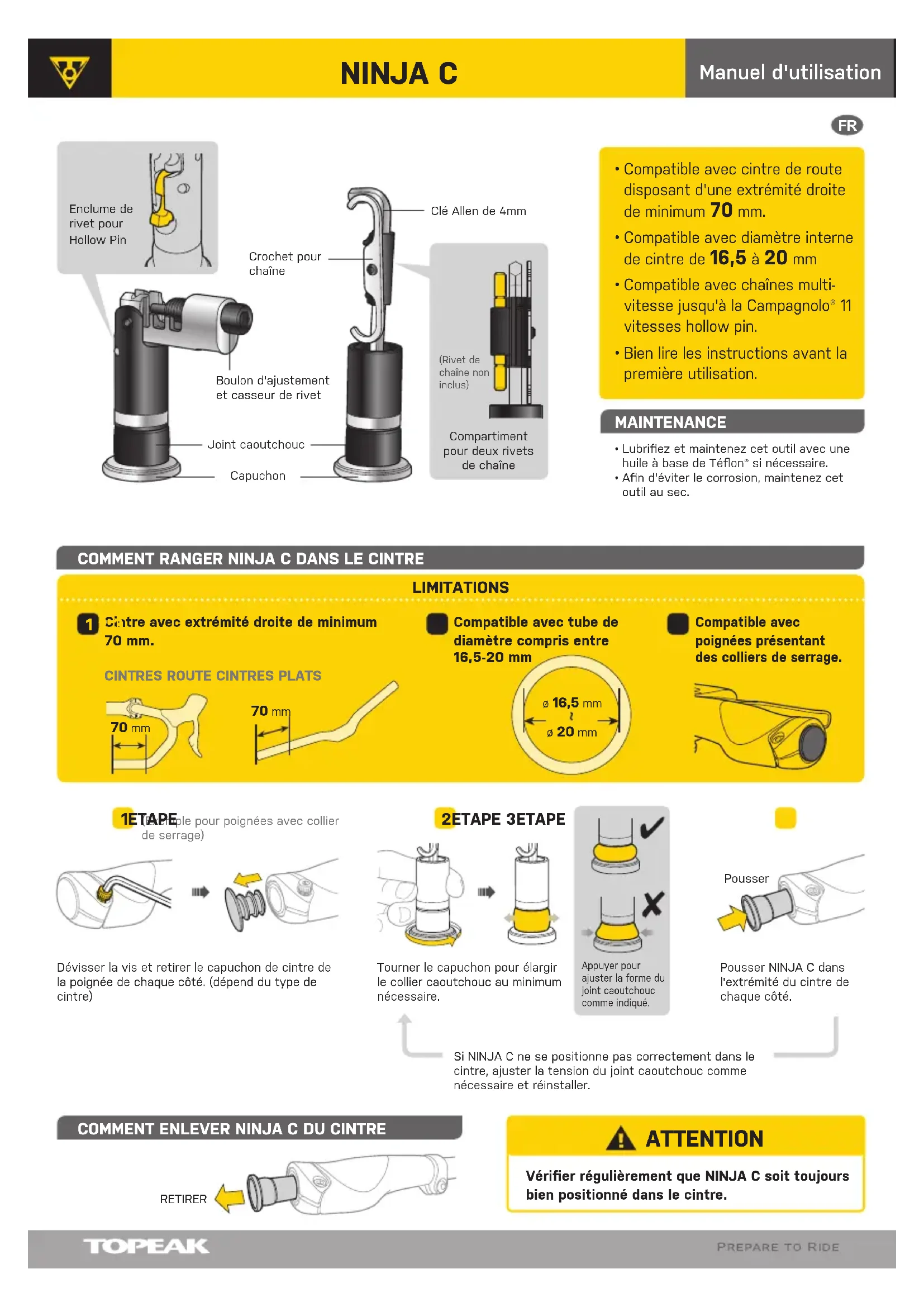 - Bien lire les instructions avant la première utilisation. Crochet pour chaîneClé Allen de 4mm(Rivet de chaîne non inclus)Boulon d'ajustement et casseur de rivetVérifier régulièrement que NINJA C soit toujours bien positionné dans le cintre. ATTENTION