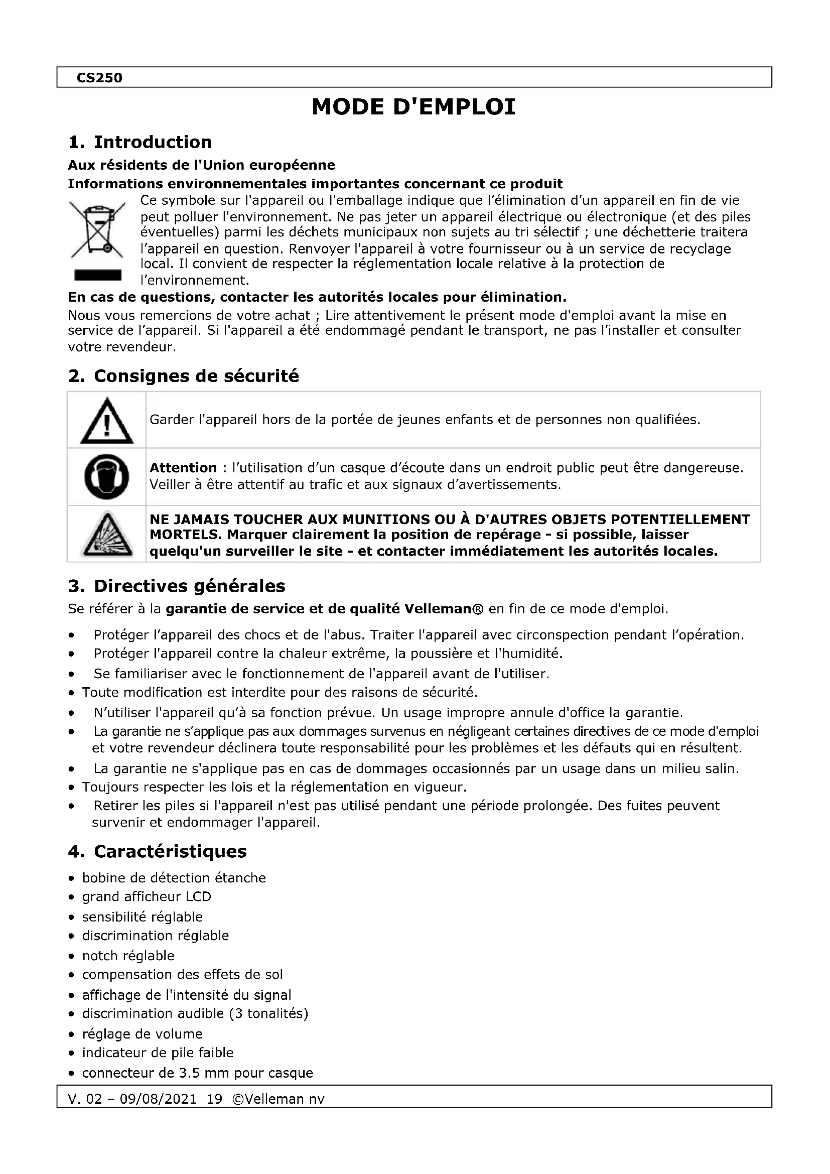 N’employer cet appareil qu’avec des accessoires d’origine. La SA Velleman ne peut, dans la mesure conforme au droit applicable être tenue responsable des dommages ou lésions (directs ou indirects) pouvant résulter de l’utilisation de cet appareil. Pour plus d'informations concernant cet article et la dernière version de ce mode d'emploi, consulter notre site www.velleman.eu. Les spécifications et le continu de ce mode d'emploi peuvent être modifiés sans notification préalable. Déclaration de conformité RED Par la présente, Velleman SA, déclare que le type d'équipement [CS250] est conforme à la norme 2014/53/EU. Le texte complet de la déclaration de conformité est disponible sur la page web suivante : www.velleman.eu.
