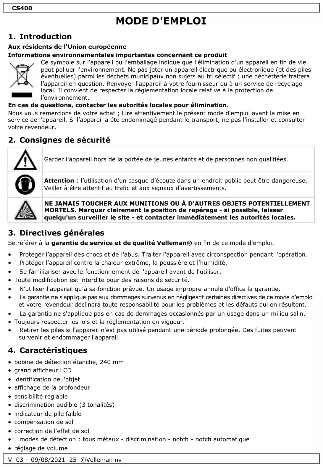 CS400 - Détecteur VELLEMAN - Notice d'utilisation et mode d'emploi gratuit