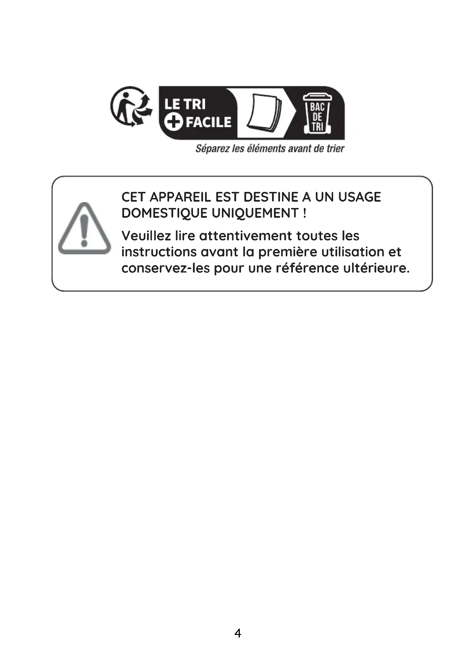 3CET APPAREIL EST DESTINE A UN USAGE DOMESTIQUE UNIQUEMENT ! Veuillez lire attentivement toutes les instructions avant la première utilisation et conservez-les pour une référence ultérieure. 4Consigne de sécurité Dans l’intérêt de votre sécurité, lisez soigneusement des instructions avant d’utiliser votre appareil. L’installation Risque de choc électrique