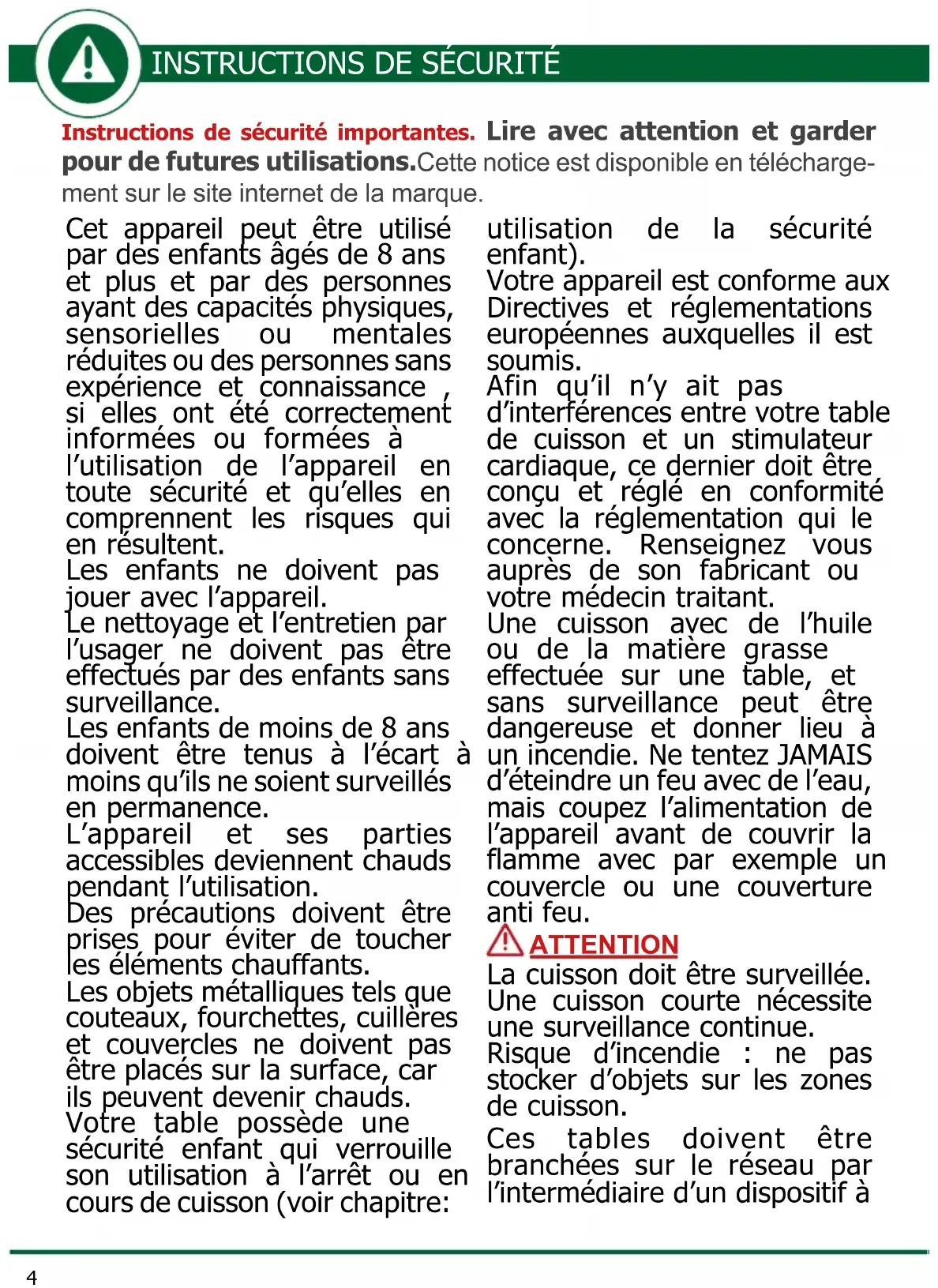 Instructions de sécurité importantes. Lire avec attention et garder pour de futures utilisations. Cette notice est disponible en télécharge- ment sur le site internet de la marque. Cet appareil peut être utilisé par des enfants âgés de 8 ans et plus et par des personnes ayant des capacités physiques, sensorielles ou mentales réduites ou des personnes sans expérience et connaissance , si elles ont été correctement informées ou formées à l’utilisation de l’appareil en toute sécurité et qu’elles en comprennent les risques qui en résultent. Les enfants ne doivent pas jouer avec l’appareil. Le nettoyage et l’entretien par l’usager ne doivent pas être effectués par des enfants sans surveillance. Les enfants de moins de 8 ans doivent être tenus à l’écart à moins qu’ils ne soient surveillés en permanence. L’appareil et ses parties accessibles deviennent chauds pendant l’utilisation. Des précautions doivent être prises pour éviter de toucher les éléments chauffants. Les objets métalliques tels que couteaux, fourchettes, cuillères et couvercles ne doivent pas être placés sur la surface, car ils peuvent devenir chauds. Votre table possède une sécurité enfant qui verrouille son utilisation à l’arrêt ou en cours de cuisson (voir chapitre: utilisation de la sécurité enfant). Votre appareil est conforme aux Directives et réglementations européennes auxquelles il est soumis. Afin qu’il n’y ait pas d’interférences entre votre table de cuisson et un stimulateur cardiaque, ce dernier doit être conçu et réglé en conformité avec la réglementation qui le concerne. Renseignez vous auprès de son fabricant ou votre médecin traitant. Une cuisson avec de l’huile ou de la matière grasse effectuée sur une table, et sans surveillance peut être dangereuse et donner lieu à un incendie. Ne tentez JAMAIS d’éteindre un feu avec de l’eau, mais coupez l’alimentation de l’appareil avant de couvrir la flamme avec par exemple un couvercle ou une couverture anti feu. ATTENTION La cuisson doit être surveillée. Une cuisson courte nécessite une surveillance continue. Risque d’incendie : ne pas stocker d’objets sur les zones de cuisson. Ces tables doivent être branchées sur le réseau par l’intermédiaire d’un dispositif àINSTRUCTIONS DE SÉCURITÉ INSTRUCTIONS DE SÉCURITÉ