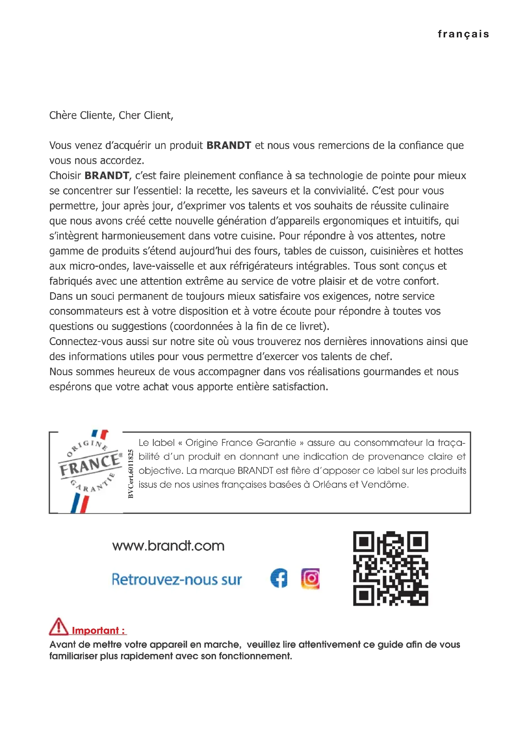 5français www.brandt.com BVCert.6011825 Important : Avant de mettre votre appareil en marche, veuillez lire attentivement ce guide afin de vous familiariser plus rapidement avec son fonctionnement. Le label « Origine France Garantie » assure au consommateur la traça- bilité d’un produit en donnant une indication de provenance claire et objective. La marque BRANDT est fière d’apposer ce label sur les produits issus de nos usines françaises basées à Orléans et Vendôme. Chère Cliente, Cher Client, Vous venez d’acquérir un produit BRANDT et nous vous remercions de la conance que vous nous accordez. Choisir BRANDT, c’est faire pleinement conance à sa technologie de pointe pour mieux se concentrer sur l’essentiel: la recette, les saveurs et la convivialité. C’est pour vous permettre, jour après jour, d’exprimer vos talents et vos souhaits de réussite culinaire que nous avons créé cette nouvelle génération d’appareils ergonomiques et intuitifs, qui s’intègrent harmonieusement dans votre cuisine. Pour répondre à vos attentes, notre gamme de produits s’étend aujourd’hui des fours, tables de cuisson, cuisinières et hottes aux micro-ondes, lave-vaisselle et aux réfrigérateurs intégrables. Tous sont conçus et fabriqués avec une attention extrême au service de votre plaisir et de votre confort. Dans un souci permanent de toujours mieux satisfaire vos exigences, notre service consommateurs est à votre disposition et à votre écoute pour répondre à toutes vos questions ou suggestions (coordonnées à la n de ce livret). Connectez-vous aussi sur notre site où vous trouverez nos dernières innovations ainsi que des informations utiles pour vous permettre d’exercer vos talents de chef. Nous sommes heureux de vous accompagner dans vos réalisations gourmandes et nous espérons que votre achat vous apporte entière satisfaction.français Cet appareil peut être utilisé par des enfants âgés de 8 ans et plus et par des personnes ayant des capacités physiques, sensorielles ou mentales réduites ou des personnes sans expérience et connaissance , si elles ont été correctement informées ou formées à l’utilisation de l’appareil en toute sécurité et qu’elles en comprennent les risques qui en résultent. Les enfants ne doivent pas jouer avec l’appareil. Le nettoyage et l’entretien par l’usager ne doivent pas être effectués par des enfants sans surveillance. Les enfants de moins de 8 ans doivent être tenus à l’écart à moins qu’ils ne soient surveillés en permanence. L’appareil et ses parties accessibles deviennent chauds pendant l’utilisation. Des précautions doivent être prises pour éviter de toucher les éléments chauffants. Les objets métalliques tels que couteaux, fourchettes, cuillères et couvercles ne doivent pas être placés sur la surface, car ils peuvent devenir chauds. Votre table possède une sécurité enfant qui verrouille son utilisation à l’arrêt ou en cours de cuisson (voir chapitre: utilisation de la sécurité enfant). Votre appareil est conforme aux Directives et réglementations européennes auxquelles il est soumis. An qu’il n’y ait pas d’interférences entre votre table de cuisson et un stimulateur cardiaque, ce dernier doit être conçu et réglé en conformité avec la réglementation qui le concerne. Renseignez vous auprès de son fabricant ou votre médecin traitant. Une cuisson avec de l’huile ou de la matière grasse effectuée sur une table, et sans surveillance peut être dangereuse et donner lieu à un incendie. Ne tentez JAMAIS d’éteindre un feu avec de l’eau, mais coupez l’alimentation de l’appareil avant de couvrir la amme avec par exemple un couvercle ou une couverture anti feu. ATTENTION : la cuisson doit être surveillée. Une cuisson courte nécessite une surveillance continue. Risque d’incendie : ne pas stocker d’objets sur les zones de cuisson. Si la surface est ssurée, déconnecter l’appareil pour éviter INSTRUCTIONS DE SÉCURITÉ IMPORTANTES A LIRE AVEC ATTENTION AVANT UTILISATION ET A CONSERVER POUR DE FUTURES UTILISATIONS. Cette notice est disponible en téléchargement sur le site internet de la marque. Instructions de sécuritéfrançais le risque de choc électrique. Ne plus utiliser votre table avant changement du dessus verre. Evitez les chocs avec les récipients: la surface verre vitrocéramique est très résistante, mais n’est toutefois pas incassable. Ne pas poser de couvercle chaud à plat sur votre table de cuisson. Un effet «ventouse» risquerait d’endommager le dessus vitrocéramique. Evitez les frottements de récipients qui peuvent à la longue générer une dégradation du décor sur le dessus vitrocéramique. Pour la cuisson, n’utilisez jamais de feuille de papier d’aluminium. Ne déposez jamais des produits emballés avec de l’aluminium, ou en barquette d’aluminium sur votre table de cuisson. L’aluminium fondrait et endommagerait dénitivement votre appareil de cuisson. Ne rangez pas dans le meuble situé sous votre table de cuisson vos produits d’entretien ou produits inammables. Si le câble d’alimentation est endommagé, il doit être remplacé par le fabricant, son Service Après-Vente ou des personnes de qualication similaire an d’éviter un danger. Assurez-vous que le câble d’alimentation d’un appareil électrique branché à proximité de la table, n’est pas en contact avec les zones de cuisson. N’utilisez jamais de nettoyeur vapeur pour l’entretien de votre table. L’appareil n’est pas destiné à être mis en fonctionnement au moyen d’une minuterie externe ou d’un système de commande à distance séparé. MISE EN GARDE : Utilisez uniquement des protections de tables conçues par le fabricant de l’appareil de cuisson, référencées dans la notice d’utilisation comme étant adaptées, ou incorporées à l’appareil. L’utilisation de protections non appropriées peut p