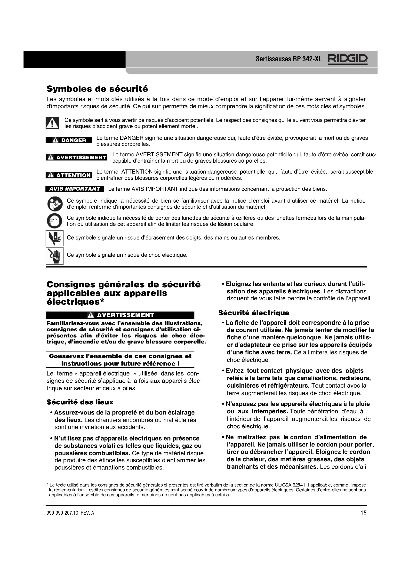 RP 342-XL Press Tool NOTICESertisseuses RP 342-XL Enregistrez ci-dessous pour future référence le numéro de série de l’appareil indiqué sur sa plaquesignalétique.N° de série Sertisseuses RP 342-XL AVERTISSEMENT ! Familiarisez-vous avec le manuel ci- présent avant d’utiliser l’appareil. Tout écart aux consignes données dans celui-ci augmenterait les risques de choc électrique, d’incendie et/ou de grave blessure corporelle.999-999-207.10_REV. A
