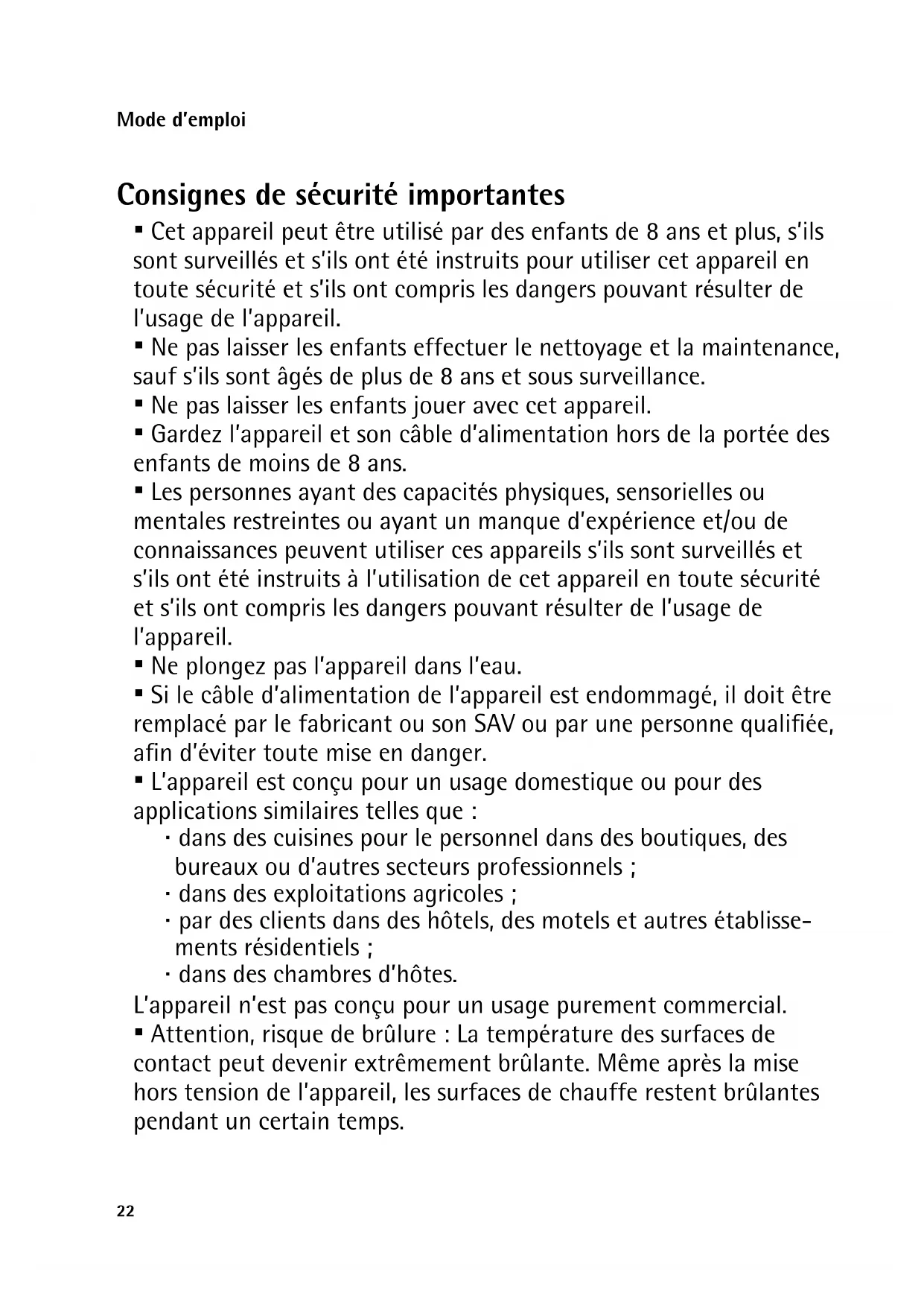 - Cet appareil peut être utilisé par des enfants de 8 ans et plus, s’ils sont surveillés et s’ils ont été instruits pour utiliser cet appareil en toute sécurité et s’ils ont compris les dangers pouvant résulter de l’usage de l’appareil.