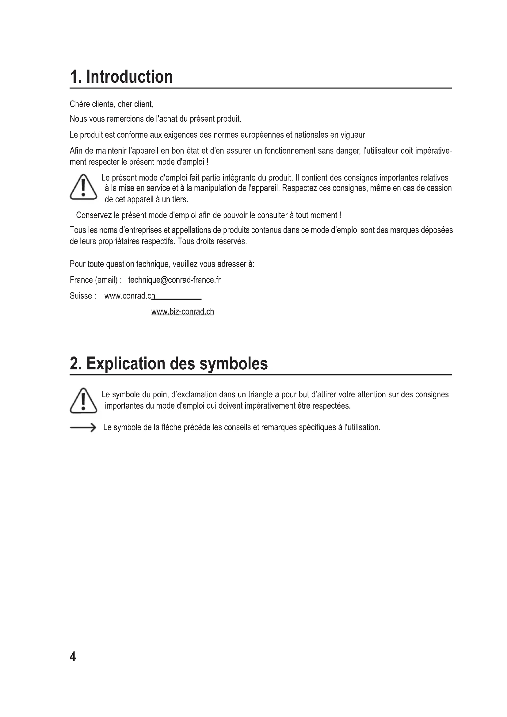 Chère cliente, cher client, Nous vous remercions de l'achat du présent produit. Le produit est conforme aux exigences des normes européennes et nationales en vigueur. Andemaintenirl'appareilenbonétatetd'enassurerunfonctionnementsansdanger,l'utilisateurdoitimpérative- ment respecter le présent mode d'emploi ! Le présent mode d'emploi fait partie intégrante du produit. Il contient des consignes importantes relatives à la mise en service et à la manipulation de l'appareil. Respectez ces consignes, même en cas de cession de cet appareil à un tiers. Conservezleprésentmoded'emploiandepouvoirleconsulteràtoutmoment! Tous les noms d’entreprises et appellations de produits contenus dans ce mode d’emploi sont des marques déposées de leurs propriétaires respectifs. Tous droits réservés. Pour toute question technique, veuillez vous adresser à: France(email): technique@conrad-france.fr Suisse : www.conrad.ch www.biz-conrad.ch
