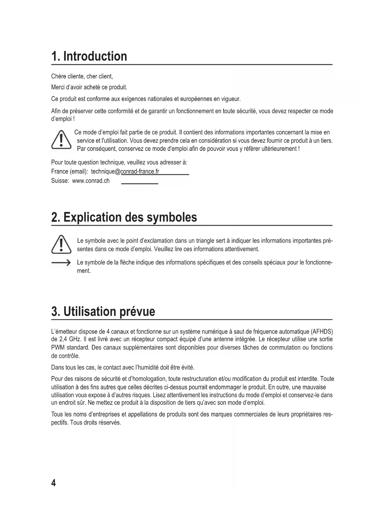 L’émetteur dispose de 4 canaux et fonctionne sur un système numérique à saut de fréquence automatique (AFHDS) de 2,4 GHz. Il est livré avec un récepteur compact équipé d’une antenne intégrée. Le récepteur utilise une sortie PWM standard. Des canaux supplémentaires sont disponibles pour diverses tâches de commutation ou fonctions de contrôle. Dans tous les cas, le contact avec l’humidité doit être évité. Pour des raisons de sécurité et d’homologation, toute restructuration et/ou modication du produit est interdite. Toute utilisation à des ns autres que celles décrites ci-dessus pourrait endommager le produit. En outre, une mauvaise utilisation vous expose à d’autres risques. Lisez attentivement les instructions du mode d’emploi et conservez-le dans un endroit sûr. Ne mettez ce produit à la disposition de tiers qu’avec son mode d’emploi. Tous les noms d’entreprises et appellations de produits sont des marques commerciales de leurs propriétaires res- pectifs. Tous droits réservés.5