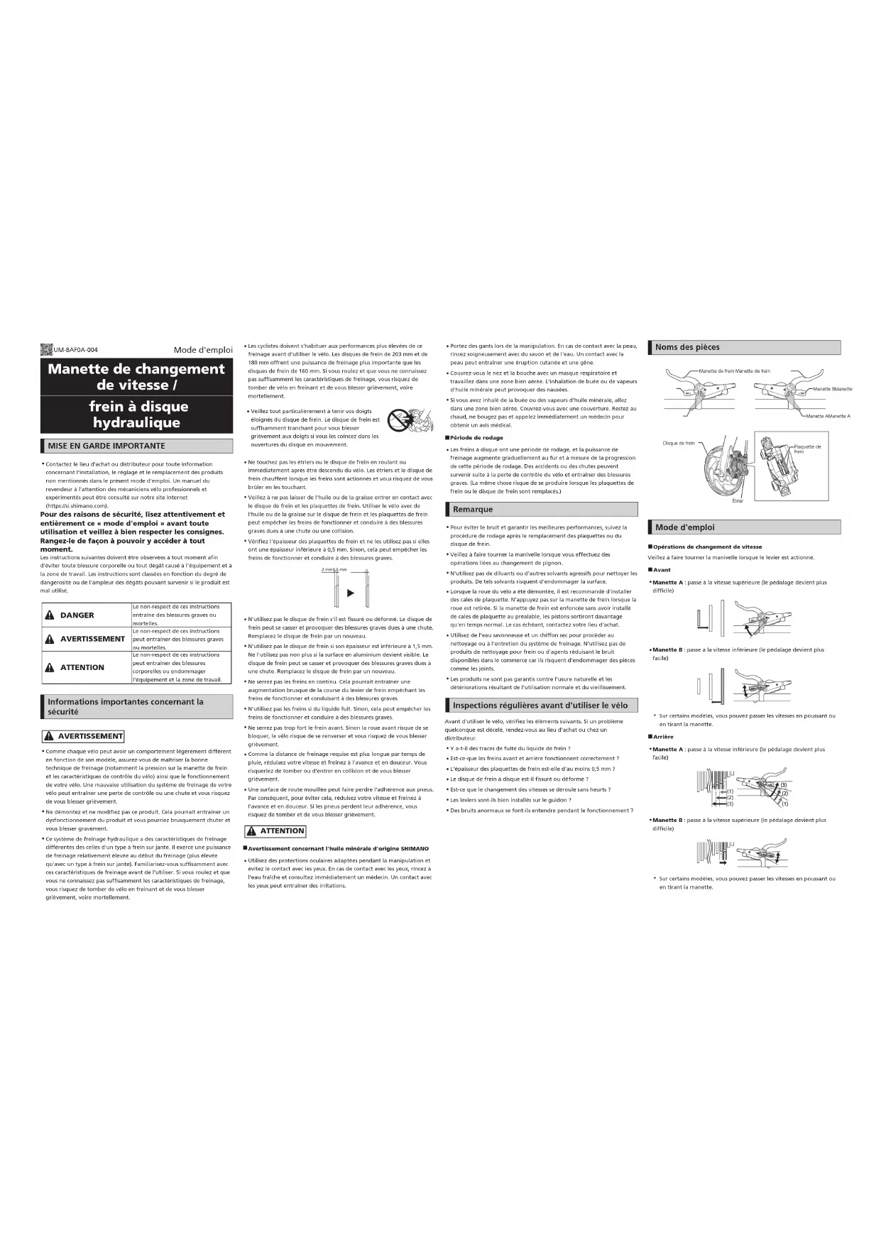 Manette B: passe à la vitesse supérieure (le pédalage devient plus difficile)* Sur certains modèles, vous pouvez passer les vitesses en poussant ou en tirant la manette. UM-8AF0A-004 Mode d'emploi Actionner les freins Ce produit dispose d'une fonction de réglage de la portée. Si les manettes de frein semblent trop éloignées et sont difficiles à atteindre, contactez le lieu d'achat ou un distributeur. Comment effectuer le rodage Pour optimiser les performances des plaquettes de frein et du disque de frein, suivez la procédure de rodage expliquée dans les étapes ci-dessous: