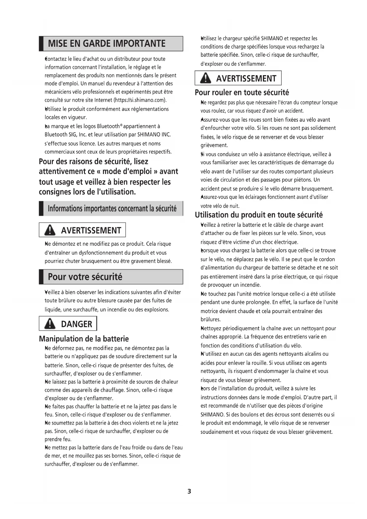 appartiennent à Bluetooth SIG, Inc. et leur utilisation par SHIMANO INC. s'effectue sous licence. Les autres marques et noms commerciaux sont ceux de leurs propriétaires respectifs. Pour des raisons de sécurité, lisez attentivement ce « mode d'emploi » avant tout usage et veillez à bien respecter les consignes lors de l'utilisation. Informations importantes concernant la sécurité AVERTISSEMENT