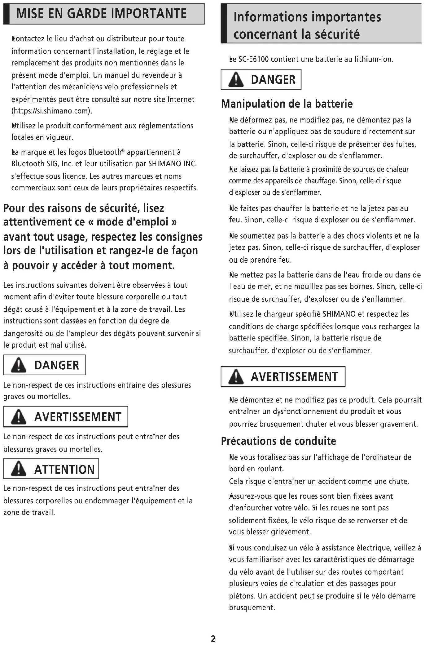 appartiennent à BluetoothSIG, Inc. et leur utilisation par SHIMANOINC. s'effectue sous licence. Les autres marques et noms commerciaux sont ceux de leurs propriétaires respectifs. Pour des raisons de sécurité, lisez attentivement ce « mode d'emploi » avant tout usage, respectez les consignes lors de l'utilisation et rangez-le de façon à pouvoir y accéder à tout moment. Les instructions suivantes doivent être observées à tout moment afin d'éviter toute blessure corporelle ou tout dégât causé à l'équipement et à la zone de travail. Les instructions sont classées en fonction du degré de dangerosité ou de l'ampleur des dégâts pouvant survenir si le produit est mal utilisé. DANGER Le non-respect de ces instructions entraîne des blessures graves ou mortelles. AVERTISSEMENT Le non-respect de ces instructions peut entraîner des blessures graves ou mortelles. ATTENTION Le non-respect de ces instructions peut entraîner des blessures corporelles ou endommager l'équipement et la zone de travail. Informations importantes concernant la sécurité