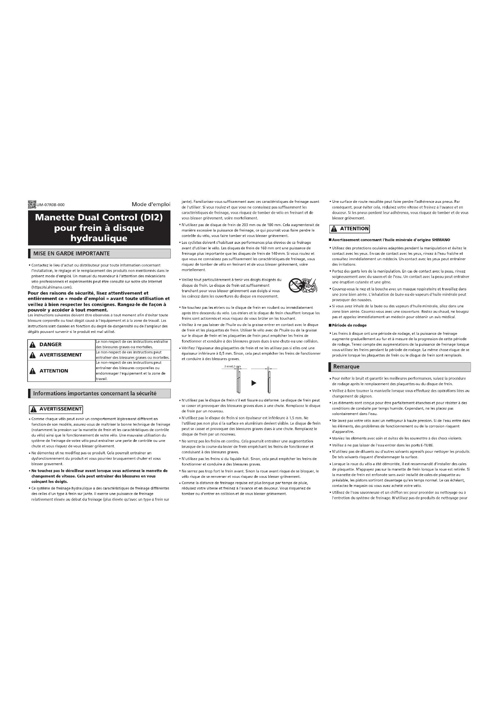 Contactez le lieu d'achat ou distributeur pour toute information concernant l'installation, le réglage et le remplacement des produits non mentionnés dans le présent mode d'emploi. Un manuel du revendeur à l'attention des mécaniciens vélo professionnels et expérimentés peut être consulté sur notre site Internet (https://si.shimano.com). Pour des raisons de sécurité, lisez attentivement et entièrement ce « mode d'emploi » avant toute utilisation et veillez à bien respecter les consignes. Rangez-le de façon à pouvoir y accéder à tout moment. Les instructions suivantes doivent être observées à tout moment afin d'éviter toute blessure corporelle ou tout dégât causé à l'équipement et à la zone de travail. Les instructions sont classées en fonction du degré de dangerosité ou de l'ampleur des dégâts pouvant survenir si le produit est mal utilisé. DANGER Le non-respect de ces instructions entraîne des blessures graves ou mortelles. AVERTISSEMENT Le non-respect de ces instructions peut entraîner des blessures graves ou mortelles. ATTENTION Le non-respect de ces instructions peut entraîner des blessures corporelles ou endommager l'équipement et la zone de travail. Informations importantes concernant la sécurité AVERTISSEMENT