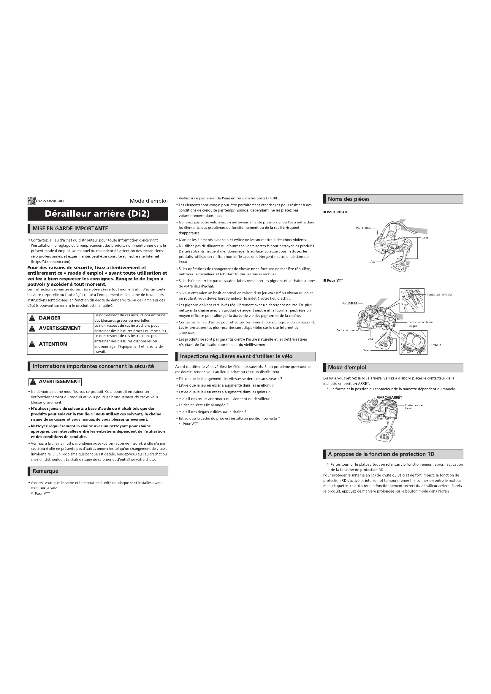 Contactez le lieu d'achat ou distributeur pour toute information concernant l'installation, le réglage et le remplacement des produits non mentionnés dans le présent mode d'emploi. Un manuel du revendeur à l'attention des mécaniciens vélo professionnels et expérimentés peut être consulté sur notre site Internet (https://si.shimano.com). Pour des raisons de sécurité, lisez attentivement et entièrement ce «mode d'emploi» avant toute utilisation et veillez à bien respecter les consignes. Rangez-le de façon à pouvoir y accéder à tout moment. Les instructions suivantes doivent être observées à tout moment afin d'éviter toute blessure corporelle ou tout dégât causé à l'équipement et à la zone de travail. Les instructions sont classées en fonction du degré de dangerosité ou de l'ampleur des dégâts pouvant survenir si le produit est mal utilisé. DANGER Le non-respect de ces instructions entraîne des blessures graves ou mortelles. AVERTISSEMENT Le non-respect de ces instructions peut entraîner des blessures graves ou mortelles. ATTENTION Le non-respect de ces instructions peut entraîner des blessures corporelles ou endommager l'équipement et la zone de travail. Informations importantes concernant la sécurité AVERTISSEMENT