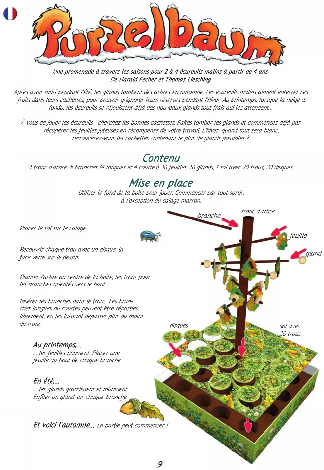 ches longues ou courtes peuvent être réparties librement, en les laissant dépasser plus ou moins du tronc. Au printemps,… … les feuilles poussent. Placer une feuille au bout de chaque branche. Et voici l’automne… La partie peut commencer ! 4+ 2–4 15–20 9But du jeu Il s’agit de rassembler le plus de feuilles et de glands ! À l’automne, les joueurs récupèrent des feuilles. En hiver, ils peuvent gagner des feuilles et des glands. Celui qui en aura rassemblé le plus avant le printemps sera le plus heureux des écureuils. Déroulement de la partie Le dernier à avoir ramassé un gland entame la partie à l’automne. Le jeu se poursuit dans le sens des aiguilles d’une montre. En automne, les joueurs peuvent gagner des feuilles s’ils réussissent à faire tomber un gland dans un trou. Un tour de jeu se déroule ainsi : Le joueur soulève un disque vert et le pose à côté de la boîte. Le joueur fait tomber un gland de l’arbre. Il doit le pousser à l’aide de la feuille derrière lui… et viser le trou dans le sol ! Bien visé ? Super ! Le joueur gagne la feuille ! Si le gland est tombé dans le trou, le joueur peut récupérer la feuille dont il s’est servi pour pousser et la poser devant lui. Qu’il ait réussi ou non, il referme ensuite le trou : il replace le disque par-dessus, mais cette fois sur la face blanche (la première neige est déjà tombée). Mal visé ? Dommage ! Le joueur ne gagne pas la feuille ! Si le gland n’est pas tombé dans le trou, le joueur place la feuille sur le disque recouvrant le trou. 10Il enterre ensuite ce gland dans un autre trou. 3 possibilités se présentent alors : Si le gland a atterri sur un disque, le joueur l’enterre dans le trou en dessous.