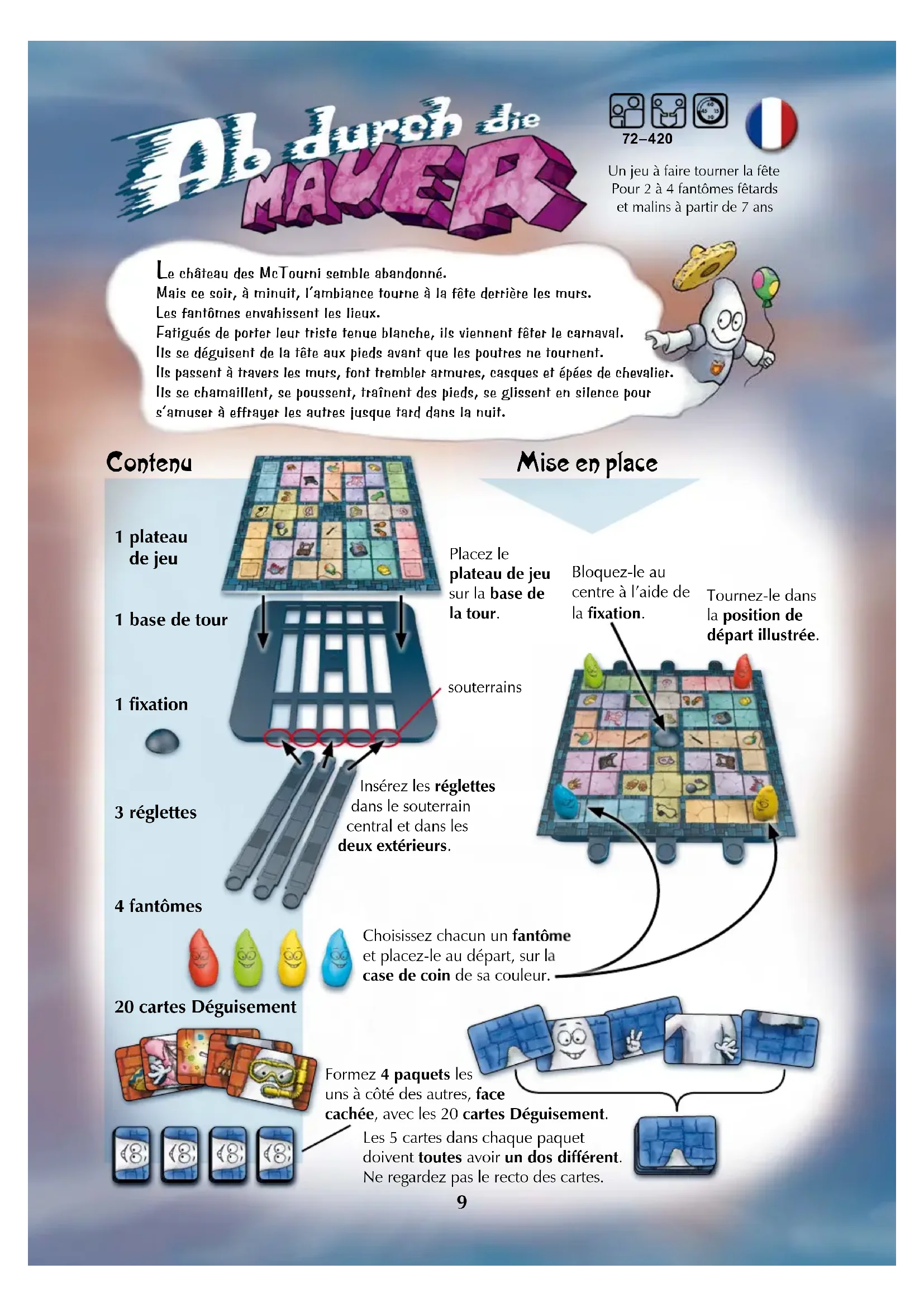 - your ghost isn’t on a garment. In either case your turn ends right after the magical moves. You are the winner, and will be celebrated as the Ghost of the Festival. If you find in the deck the garment your ghost is standing on, place it face up in front of you. If you’ve already collected other garments, arrange them all correctly together. With each card you collect, your ghost’s costume will be revealed. If the garment you’re looking for isn’t in the deck, hard luck. You don’t get a card. Variant: You may agree before the game to put the decks back in different places. Find the leder- hosen in one of the 4 decks. Your ghost is standing on lederhosen. Example: Dress your ghost in the lederhosen. If your ghost lands on the wand, you don’t search a deck as your ghost is already holding an umbrella in its hand. Found it! Didn’t find it! You are not allowed to search any more decks. You can change the order of the cards in the deck if you like.Le château des McTourni semble abandonné. Mais ce soir, à minuit, l’ambiance tourne à la fête derrière les murs. Les fantômes envahissent les lieux. Fatigués de porter leur triste tenue blanche, ils viennent fêter le carnaval. Ils se déguisent de la tête aux pieds avant que les poutres ne tournent. Ils passent à travers les murs, font trembler armures, casques et épées de chevalier. Ils se chamaillent, se poussent, traînent des pieds, se glissent en silence pour s’amuser à effrayer les autres jusque tard dans la nuit. Un jeu à faire tourner la fêtePour 2 à 4 fantômes fêtards et malins à partir de 7 ans Contenu 1 base de tour Placez le plateau de jeu sur la base de la tour. 1 plateau de jeu 4 fantômes 3 réglettes 20 cartes Déguisement 1 fixation Bloquez-le au centre à l’aide de la fixation. Tournez-le dans la position de départ illustrée. Choisissez chacun un fantôme et placez-le au départ, sur la case de coin de sa couleur. Formez 4 paquets les uns à côté des autres, face cachée, avec les 20 cartes Déguisement. Mise en place Insérez les réglettes dans le souterrain central et dans les deux extérieurs. souterrains Les 5 cartes dans chaque paquet doivent toutes avoir un dos différent. Ne regardez pas le recto des cartes.