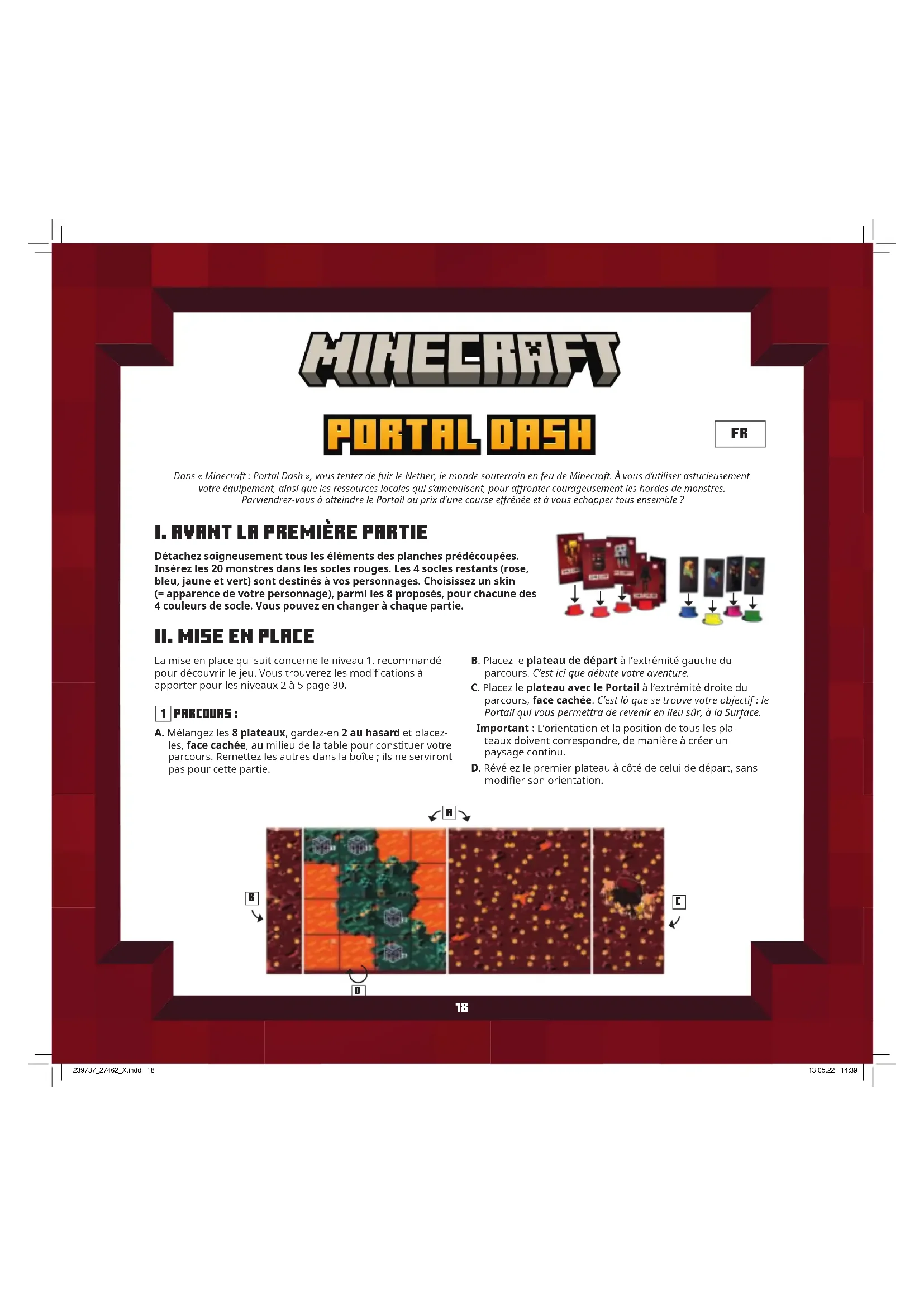 Grand cube de ressources: A. Placez le tapis à côté du plateau de jeu. Assemblez les quatre parties du gabarit et placez-le sur le tapis. B. Remplissez-le aléatoirement avec les 64 blocs (16x rouges, 16x gris, 12x or, 12x marron, 8x noirs). Secouez doucement l’ensemble pour former un gros cube. C. Enlevez ensuite le gabarit en le soulevant par les languettes en haut. Gardez-le à proximité pour y mettre les blocs « utilisés » au cours du jeu. D. Placez la che Piglins à côté du cube, retournée sur la face indiquant le nombre de joueurs ( 1-2
