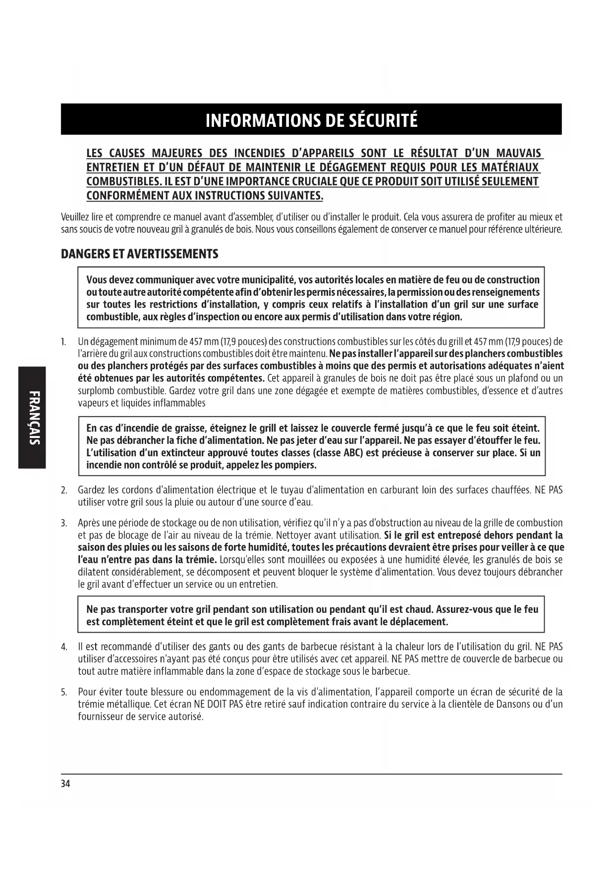 cet appareil électronique à granules. Le non-respect de ces instructions peut entraîner des dommages aux biens, des blessures ou même la mort. Communiquez avec les autorités locales en matière d’incendie et de bâtiment concernant les restrictions et les exigences d’installation dans votre région.FOR OUTDOOR AND HOUSEHOLD USE ONLY. NOT FOR COMMERCIAL USE.POUR UN USAGE EXTÉRIEUR ET DOMESTIQUE SEULEMENT. PAS POUR USAGE COMMERCIAL.