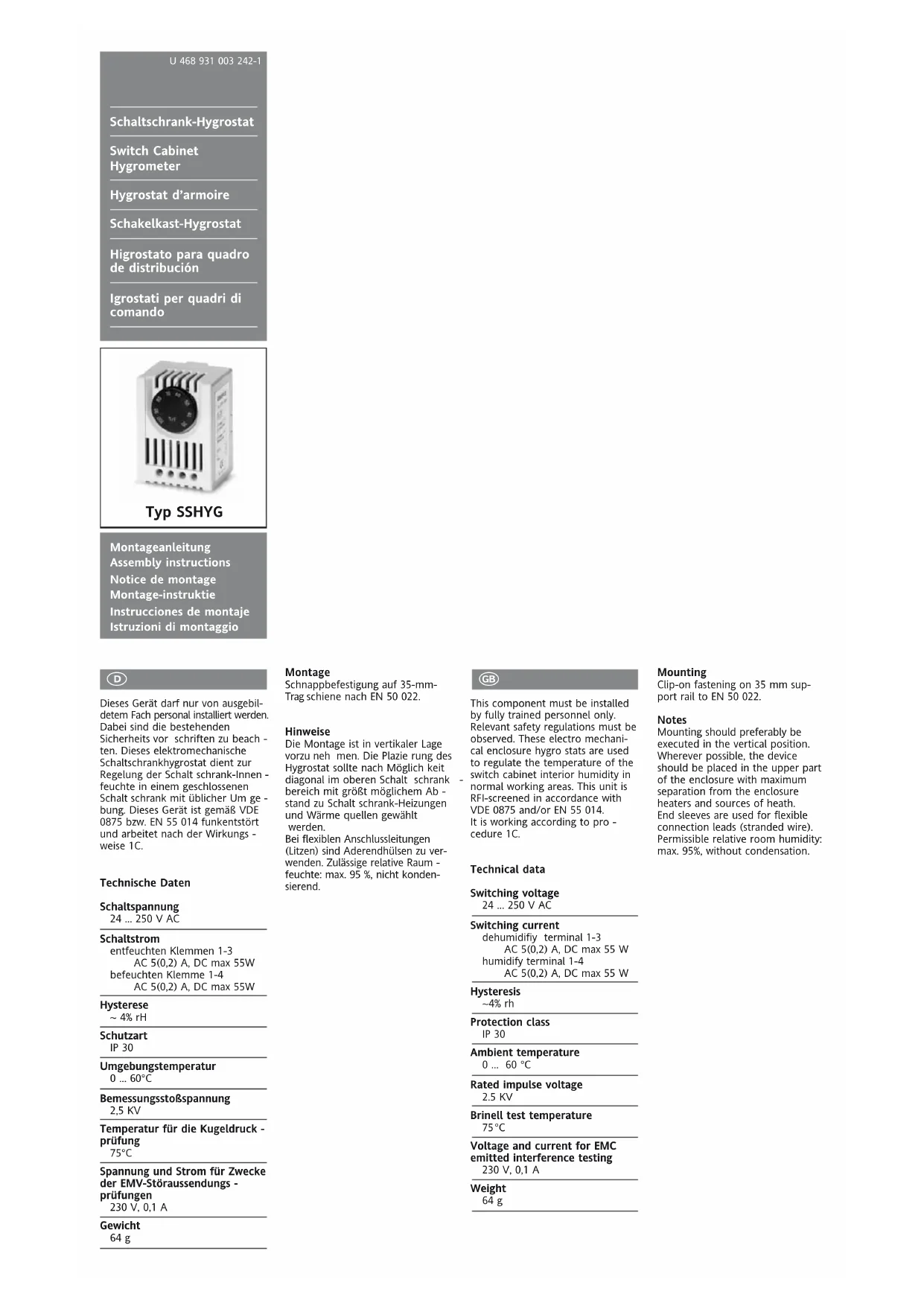 Brinell test temperature 75°C Voltage and current for EMC emitted interference testing 230 V, 0,1 A Weight 64 g Mounting Clip-on fastening on 35 mm sup- port rail to EN 50 022. Notes Mounting should preferably be executed in the vertical position. Wherever possible, the device should be placed in the upper part of the enclosure with maximum separation from the enclosure heaters and sources of heath. End sleeves are used for flexible connection leads (stranded wire). Permissible relative room humidity: max. 95%, without condensation. Typ SSHYG Seul le personnel qualifié est auto- risé à installer l’appareil. Les direc- tives de sécurité en vigueur doi- vent absolument être respectées. Le régulateur électromécaniques témperature permet d’assurer le réglage de l'humidité à l'intérieur de l'armoire électrique lorsque celle-ci est fermée et instalée en environnement usuel. L’appareil est antiparasité conformément aux normes VDE 0875 ou EN 55 014 et travaille selon processus 1C. Fabrication technique Tension de commutation 24 … 250 V AC Courant de commutation Déshumidification bornes 1-3 AC 5(0,2) A, DC max 55 W humidification bornes 1-4 AC 5(0,2) A, DC max 55 W Hystérésis ~4% rh Degré de protection IP 30 Température ambiante 0 … 60 °C Surtension transitoire dimensionnée
