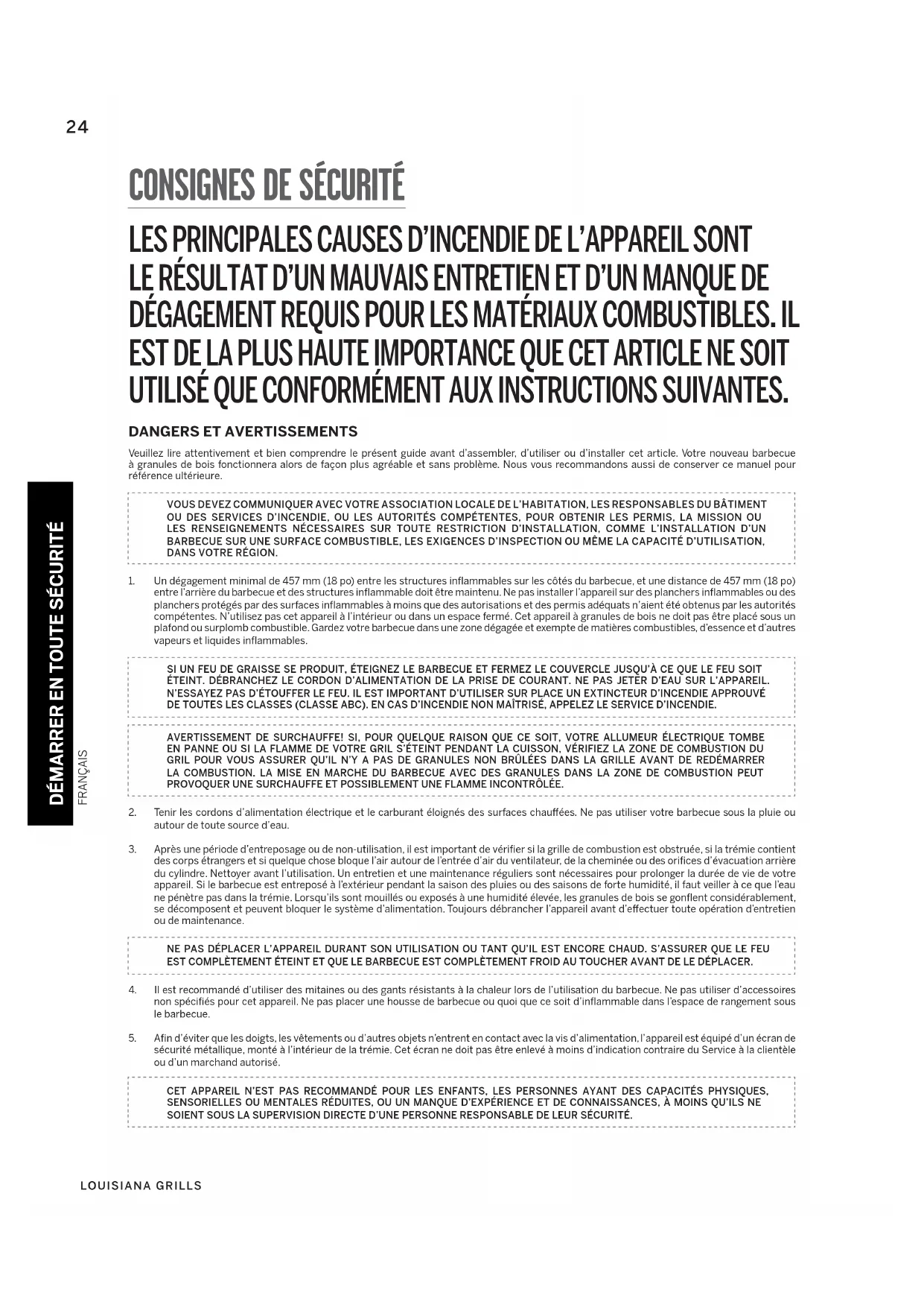 Veuillez lire attentivement et bien comprendre le présent guide avant d’assembler, d’utiliser ou d’installer cet article. Votre nouveau barbecue à granules de bois fonctionnera alors de façon plus agréable et sans problème. Nous vous recommandons aussi de conserver ce manuel pour référence ultérieure.VOUS DEVEZ COMMUNIQUER AVEC VOTRE ASSOCIATION LOCALE DE L’HABITATION, LES RESPONSABLES DU BÂTIMENT OU DES SERVICES D’INCENDIE, OU LES AUTORITÉS COMPÉTENTES, POUR OBTENIR LES PERMIS, LA MISSION OU LES RENSEIGNEMENTS NÉCESSAIRES SUR TOUTE RESTRICTION D’INSTALLATION, COMME L’INSTALLATION D’UN BARBECUE SUR UNE SURFACE COMBUSTIBLE, LES EXIGENCES D’INSPECTION OU MÊME LA CAPACITÉ D’UTILISATION, DANS VOTRE RÉGION. 1. Un dégagement minimal de 457 mm (18 po) entre les structures inflammables sur les côtés du barbecue, et une distance de 457 mm (18 po) entre l’arrière du barbecue et des structures inflammable doit être maintenu. Ne pas installer l’appareil sur des planchers inflammables ou des planchers protégés par des surfaces inflammables à moins que des autorisations et des permis adéquats n’aient été obtenus par les autorités compétentes. N’utilisez pas cet appareil à l’intérieur ou dans un espace fermé. Cet appareil à granules de bois ne doit pas être placé sous un plafond ou surplomb combustible. Gardez votre barbecue dans une zone dégagée et exempte de matières combustibles, d’essence et d’autres vapeurs et liquides inflammables.SI UN FEU DE GRAISSE SE PRODUIT, ÉTEIGNEZ LE BARBECUE ET FERMEZ LE COUVERCLE JUSQU’À CE QUE LE FEU SOIT ÉTEINT. DÉBRANCHEZ LE CORDON D’ALIMENTATION DE LA PRISE DE COURANT. NE PAS JETER D’EAU SUR L’APPAREIL. N’ESSAYEZ PAS D’ÉTOUFFER LE FEU. IL EST IMPORTANT D’UTILISER SUR PLACE UN EXTINCTEUR D’INCENDIE APPROUVÉ DE TOUTES LES CLASSES (CLASSE ABC). EN CAS D’INCENDIE NON MAÎTRISÉ, APPELEZ LE SERVICE D’INCENDIE.AVERTISSEMENT DE SURCHAUFFE! SI, POUR QUELQUE RAISON QUE CE SOIT, VOTRE ALLUMEUR ÉLECTRIQUE TOMBE EN PANNE OU SI LA FLAMME DE VOTRE GRIL S’ÉTEINT PENDANT LA CUISSON, VÉRIFIEZ LA ZONE DE COMBUSTION DU GRIL POUR VOUS ASSURER QU’IL N’Y A PAS DE GRANULES NON BRÛLÉES DANS LA GRILLE AVANT DE REDÉMARRER LA COMBUSTION. LA MISE EN MARCHE DU BARBECUE AVEC DES GRANULES DANS LA ZONE DE COMBUSTION PEUT PROVOQUER UNE SURCHAUFFE ET POSSIBLEMENT UNE FLAMME INCONTRÔLÉE. 2. Tenir les cordons d’alimentation électrique et le carburant éloignés des surfaces chauffées. Ne pas utiliser votre barbecue sous la pluie ou autour de toute source d’eau. 3. Après une période d’entreposage ou de non-utilisation, il est important de vérifier si la grille de combustion est obstruée, si la trémie contient des corps étrangers et si quelque chose bloque l’air autour de l’entrée d’air du ventilateur, de la cheminée ou des orifices d’évacuation arrière du cylindre. Nettoyer avant l’utilisation. Un entretien et une maintenance réguliers sont nécessaires pour prolonger la durée de vie de votre appareil. Si le barbecue est entreposé à l’extérieur pendant la saison des pluies ou des saisons de forte humidité, il faut veiller à ce que l’eau ne pénètre pas dans la trémie. Lorsqu’ils sont mouillés ou exposés à une humidité élevée, les granules de bois se gonflent considérablement, se décomposent et peuvent bloquer le système d’alimentation. Toujours débrancher l’appareil avant d’effectuer toute opération d’entretien ou de maintenance. NE PAS DÉPLACER L’APPAREIL DURANT SON UTILISATION OU TANT QU’IL EST ENCORE CHAUD. S’ASSURER QUE LE FEU EST COMPLÈTEMENT ÉTEINT ET QUE LE BARBECUE EST COMPLÈTEMENT FROID AU TOUCHER AVANT DE LE DÉPLACER. 4. Il est recommandé d’utiliser des mitaines ou des gants résistants à la chaleur lors de l’utilisation du barbecue. Ne pas utiliser d’accessoires non spécifiés pour cet appareil. Ne pas placer une housse de barbecue ou quoi que ce soit d’inflammable dans l’espace de rangement sous le barbecue. 5. Afin d’éviter que les doigts, les vêtements ou d’autres objets n’entrent en contact avec la vis d’alimentation, l’appareil est équipé d’un écran de sécurité métallique, monté à l’intérieur de la trémie. Cet écran ne doit pas être enlevé à moins d’indication contraire du Service à la clientèle ou d’un marchand autorisé. CET APPAREIL N’EST PAS RECOMMANDÉ POUR LES ENFANTS, LES PERSONNES AYANT DES CAPACITÉS PHYSIQUES, SENSORIELLES OU MENTALES RÉDUITES, OU UN MANQUE D’EXPÉRIENCE ET DE CONNAISSANCES, À MOINS QU’ILS NE SOIENT SOUS LA SUPERVISION DIRECTE D’UNE PERSONNE RESPONSABLE DE LEUR SÉCURITÉ.25 www.louisiana-grills.com FRANÇAIS