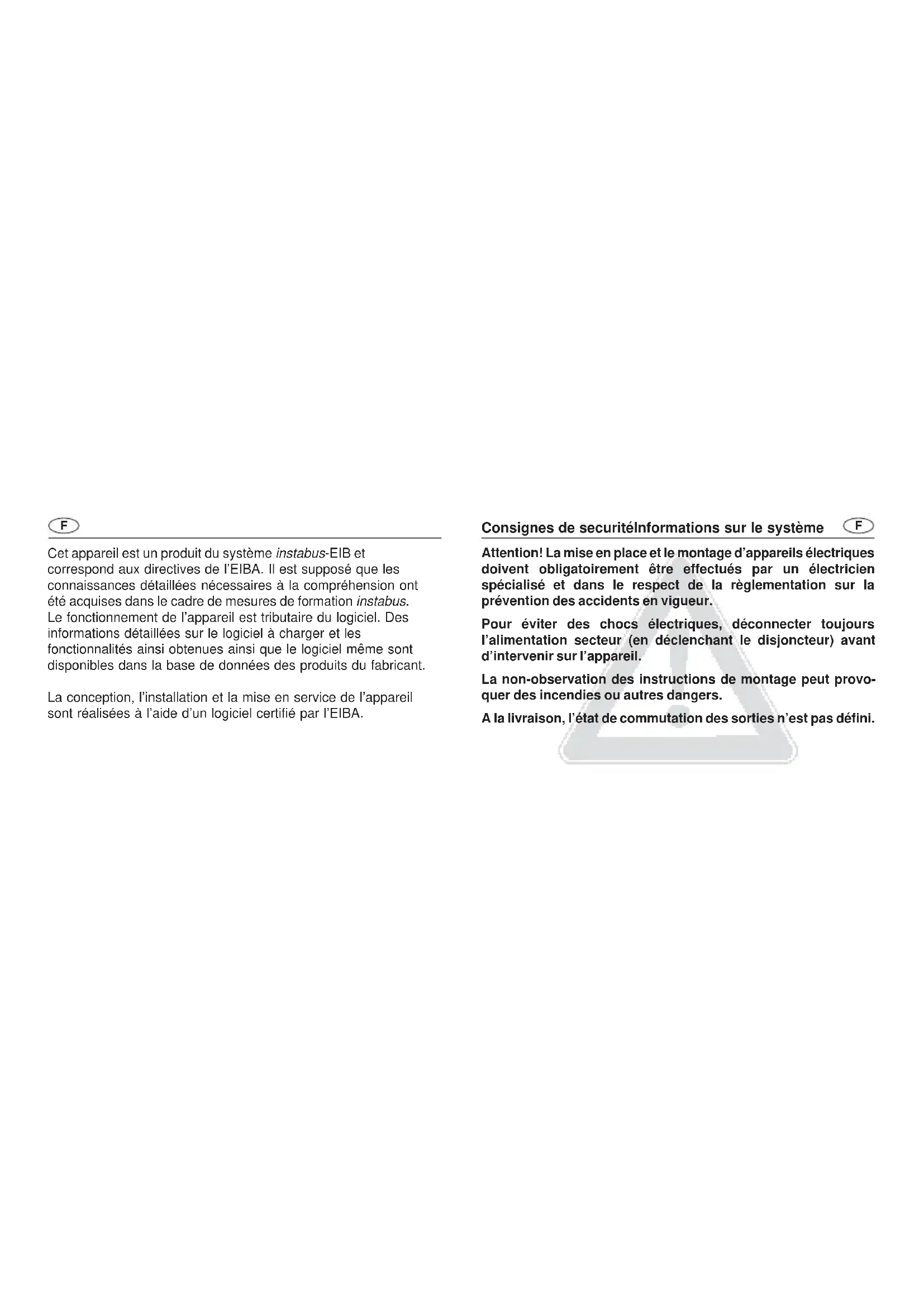 Garantie Wij bieden garantie in het kader van de wettelijke bepalingen. U gelieve het apparaat franco met een beschrijving van de fout/ storing aan onze centrale serviceafdeling te zenden: Berker GmbH & Co. KG Klagebach 38 D-58579 Schalksmühle Germany Telefoon: +49 (0) 23 55 / 90 5-0 Fax: +49 (0) 23 55 / 90 5-111 Notice de service Actionneur commutateur 4 canaux Best. Nr. 7531 40 07 Actionneur-commutateur 4 canaux, charge C Best. Nr. 7531 40 10 Actionneur-commutateur 6 canaux Best. Nr. 7531 60 02 Actionneur-commutateur 8 canaux Best. Nr. 7531 80 01 Actionneur-commutateur 8 canaux, charge C Best. Nr. 7531 80 02Cet appareil est un produit du système instabus-EIB et correspond aux directives de l’EIBA. Il est supposé que les connaissances détaillées nécessaires à la compréhension ont été acquises dans le cadre de mesures de formation instabus. Le fonctionnement de l’appareil est tributaire du logiciel. Des informations détaillées sur le logiciel à charger et les fonctionnalités ainsi obtenues ainsi que le logiciel même sont disponibles dans la base de données des produits du fabricant. La conception, l’installation et la mise en service de l’appareil sont réalisées à l’aide d’un logiciel certifié par l’EIBA. Attention! La mise en place et le montage d’appareils électriques doivent obligatoirement être effectués par un électricien spécialisé et dans le respect de la règlementation sur la prévention des accidents en vigueur. Pour éviter des chocs électriques, déconnecter toujours l’alimentation secteur (en déclenchant le disjoncteur) avant d’intervenir sur l’appareil. La non-observation des instructions de montage peut provo- quer des incendies ou autres dangers. A la livraison, l’état de commutation des sorties n’est pas défini. Consignes de securitéInformations sur le système FFInformations