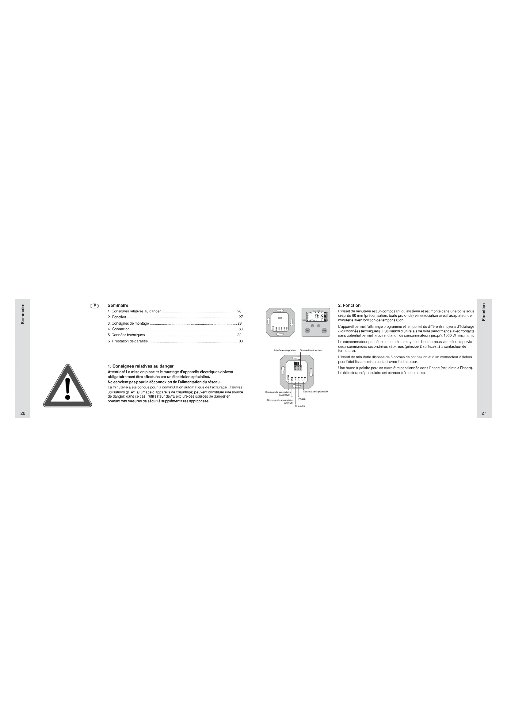 Attention! La mise en place et le montage d’appareils électriques doivent obligatoirement être effectués par un électricien spécialisé. Ne convient pas pour la déconnexion de l’alimentation du réseau. La minuterie a été conçue pour la commutation automatique de l’éclairage. D’autres utilisations (p. ex. allumage d’appareils de chauffage) peuvent constituer une source de danger; dans ce cas, l’utilisateur devra exclure ces sources de danger en prenant des mesures de sécurité supplémentaires appropriées.