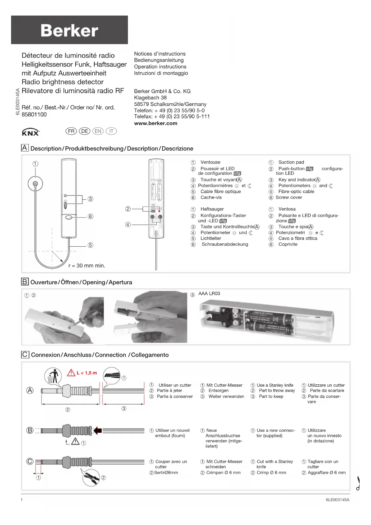 Détecteur de luminosité radio Helligkeitssensor Funk, Haftsauger mit Aufputz Auswerteeinheit Radio brightness detector Rilevatore di luminosità radio RF Berker GmbH & Co. KGKlagebach 38 58579 Schalksmühle/GermanyTelefon: + 49 (0) 23 55/90 5-0 Telefax: + 49 (0) 23 55/90 5-111 www.berker.com a ez y 6LE003145ANotices d’instructionsBedienungsanleitungOperation instructionsIstruzioni di montaggio 1 6LE003145AO Pour changer de mode de configuration, il faut obligatoirement faire un “retour usine” du produit. Sélection de l’entrée En mode configuration avec le configurateur, la sélection ou la numérotation de l’entrée se fait par un appui court sur la touche A. Configuration quicklink& Voir l’illustration . Seul le type de commande Montée/descente (motif vert/rouge) pourra être sélectionné sur les actionneurs de volets KNX lié au 85801100. Le fonctionnement obtenu cor-respondra à celui décrit dans l’illustration