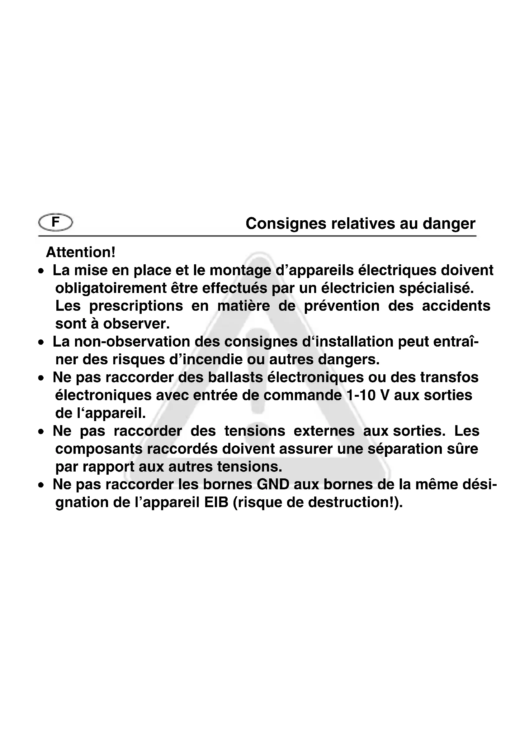- Ne pas raccorder des ballasts électroniques ou des transfos électroniques avec entrée de commande 1-10 V aux sorties de l‘appareil.
