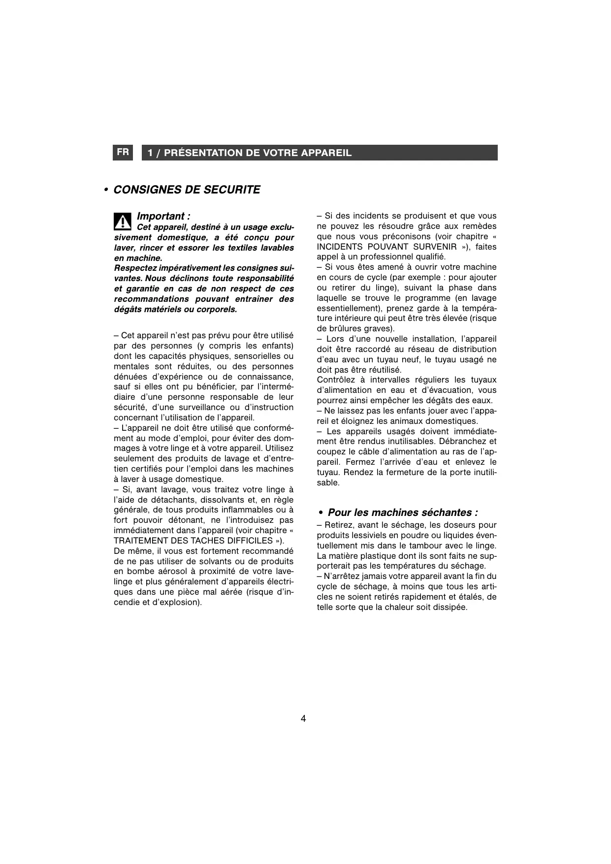 - CONSIGNES DE SECURITE Important : — Si des incidents se produisent et que vous ne pouvez les résoudre grâce aux remèdes que nous vous préconisons (voir chapitre « INCIDENTS POUVANT SURVENIR »), faites appel à un professionnel qualifié. — Si vous êtes amené à ouvrir votre machine en cours de cycle (par exemple : pour ajouter ou retirer du linge), suivant la phase dans laquelle se trouve le programme (en lavage essentiellement), prenez garde à la température intérieure qui peut être très élevée (risque de brûlures graves). — Lors d’une nouvelle installation, l’appareil doit être raccordé au réseau de distribution d’eau avec un tuyau neuf, le tuyau usagé ne doit pas être réutilisé. Contrôlez à intervalles réguliers les tuyaux d’alimentation en eau et d’évacuation, vous pourrez ainsi empêcher les dégâts des eaux. — Ne laissez pas les enfants jouer avec l’appareil et éloignez les animaux domestiques. — Les appareils usagés doivent immédiatement être rendus inutilisables. Débranchez et coupez le câble d’alimentation au ras de l’appareil. Fermez l’arrivée d’eau et enlevez le tuyau. Rendez la fermeture de la porte inutilisable. Cet appareil, destiné à un usage exclusivement domestique, a été conçu pour laver, rincer et essorer les textiles lavables en machine. Respectez impérativement les consignes suivantes. Nous déclinons toute responsabilité et garantie en cas de non respect de ces recommandations pouvant entraîner des dégâts matériels ou corporels. — Cet appareil n’est pas prévu pour être utilisé par des personnes (y compris les enfants) dont les capacités physiques, sensorielles ou mentales sont réduites, ou des personnes dénuées d’expérience ou de connaissance, sauf si elles ont pu bénéficier, par l’intermédiaire d’une personne responsable de leur sécurité, d’une surveillance ou d’instruction concernant l’utilisation de l’appareil. — L’appareil ne doit être utilisé que conformément au mode d’emploi, pour éviter des dommages à votre linge et à votre appareil. Utilisez seulement des produits de lavage et d’entretien certifiés pour l’emploi dans les machines à laver à usage domestique. — Si, avant lavage, vous traitez votre linge à l’aide de détachants, dissolvants et, en règle générale, de tous produits inflammables ou à fort pouvoir détonant, ne l’introduisez pas immédiatement dans l’appareil (voir chapitre « TRAITEMENT DES TACHES DIFFICILES »). De même, il vous est fortement recommandé de ne pas utiliser de solvants ou de produits en bombe aérosol à proximité de votre lavelinge et plus généralement d’appareils électriques dans une pièce mal aérée (risque d’incendie et d’explosion).