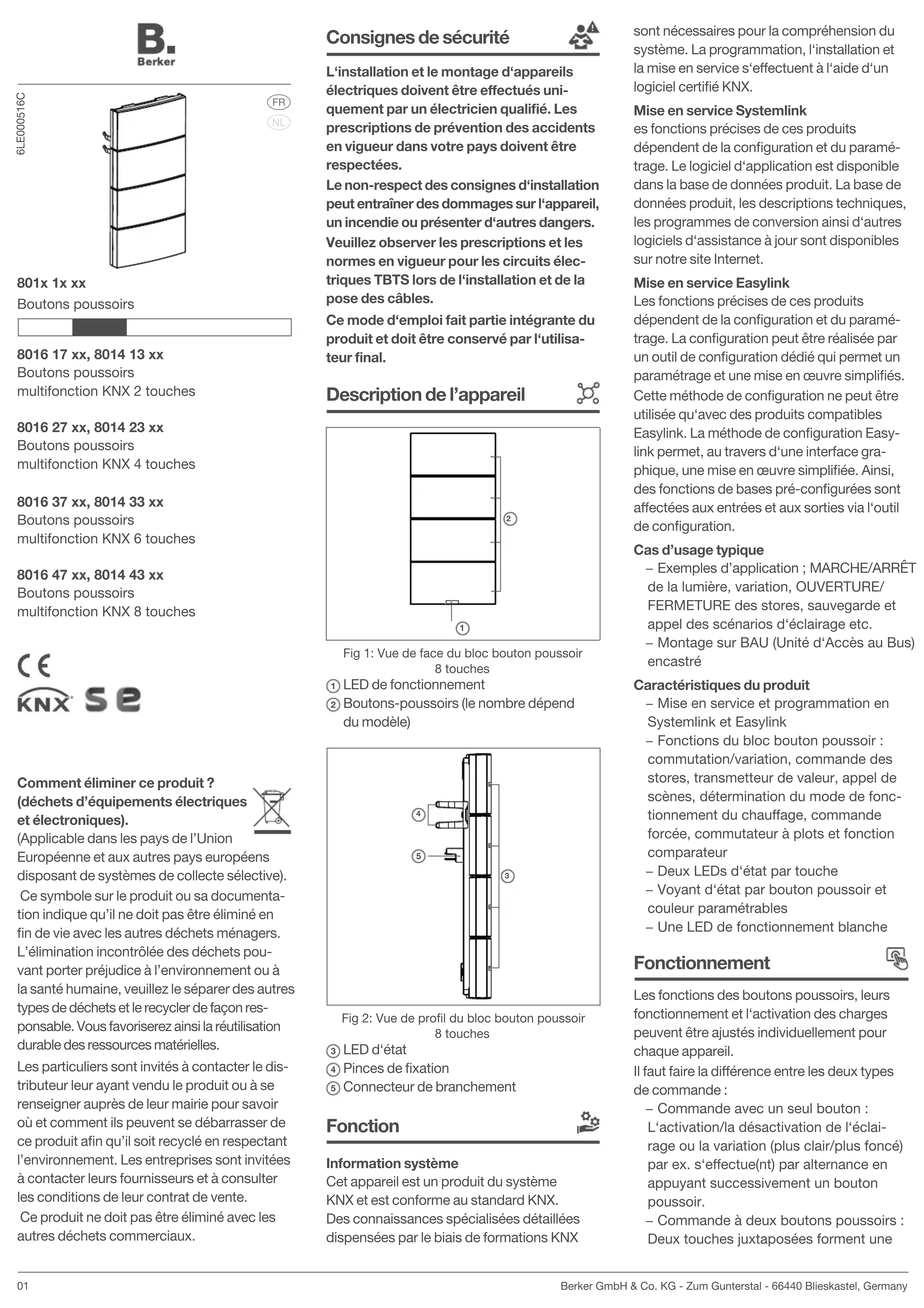 Berker GmbH & Co. KG - Zum Gunterstal - 66440 Blieskastel, Germany 8016 17 xx, 8014 13 xx Boutons poussoirs multifonction KNX 2 touches 8016 27 xx, 8014 23 xx Boutons poussoirs multifonction KNX 4 touches 8016 37 xx, 8014 33 xx Boutons poussoirs multifonction KNX 6 touches 8016 47 xx, 8014 43 xx Boutons poussoirs multifonction KNX 8 touches 801x 1x xx Boutons poussoirs 6LE000516C sont nécessaires pour la compréhension du système. La programmation, l‘installation et la mise en service s‘eectuent à l‘aide d‘un logiciel certifié KNX. Mise en service Systemlink es fonctions précises de ces produits dépendent de la configuration et du paramé- trage. Le logiciel d‘application est disponible dans la base de données produit. La base de données produit, les descriptions techniques, les programmes de conversion ainsi d‘autres logiciels d‘assistance à jour sont disponibles sur notre site Internet. Mise en service Easylink Les fonctions précises de ces produits dépendent de la configuration et du paramé- trage. La configuration peut être réalisée par un outil de configuration dédié qui permet un paramétrage et une mise en œuvre simplifiés. Cette méthode de configuration ne peut être utilisée qu‘avec des produits compatibles Easylink. La méthode de configuration Easy- link permet, au travers d‘une interface gra- phique, une mise en œuvre simplifiée. Ainsi, des fonctions de bases pré-configurées sont aectées aux entrées et aux sorties via l‘outil de configuration. Cas d’usage typique − Exemples d’application ; MARCHE/ARRÊT de la lumière, variation, OUVERTURE/ FERMETURE des stores, sauvegarde et appel des scénarios d‘éclairage etc. − Montage sur BAU (Unité d‘Accès au Bus) encastré Caractéristiques du produit − Mise en service et programmation en Systemlink et Easylink − Fonctions du bloc bouton poussoir : commutation/variation, commande des stores, transmetteur de valeur, appel de scènes, détermination du mode de fonc- tionnement du chauage, commande forcée, commutateur à plots et fonction comparateur − Deux LEDs d‘état par touche − Voyant d‘état par bouton poussoir et couleur paramétrables − Une LED de fonctionnement blanche Fonctionnement Les fonctions des boutons poussoirs, leurs fonctionnement et l‘activation des charges peuvent être ajustés individuellement pour chaque appareil. Il faut faire la diérence entre les deux types de commande : − Commande avec un seul bouton : L‘activation/la désactivation de l‘éclai- rage ou la variation (plus clair/plus foncé) par ex. s‘eectue(nt) par alternance en appuyant successivement un bouton poussoir. − Commande à deux boutons poussoirs : Deux touches juxtaposées forment une Consignes de sécurité L‘installation et le montage d‘appareils électriques doivent être eectués uni- quement par un électricien qualifié. Les prescriptions de prévention des accidents en vigueur dans votre pays doivent être respectées. Le non-respect des consignes d‘installation peut entraîner des dommages sur l‘appareil, un incendie ou présenter d‘autres dangers. Veuillez observer les prescriptions et les normes en vigueur pour les circuits élec- triques TBTS lors de l‘installation et de la pose des câbles. Ce mode d‘emploi fait partie intégrante du produit et doit être conservé par l‘utilisa- teur final. Description de l’appareil