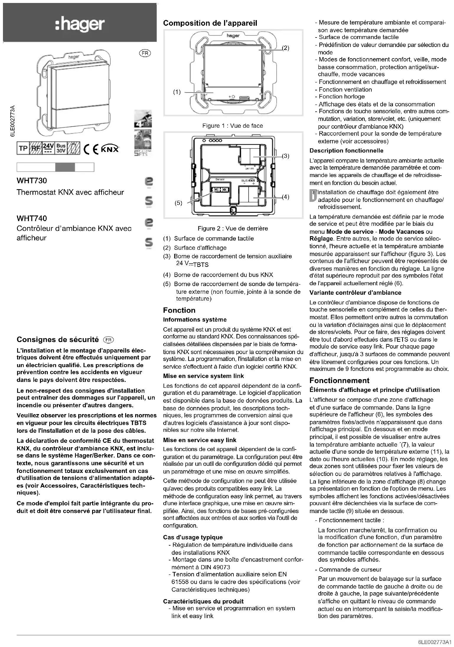 å ` 6LE002773A1 6LE002773A2 6LE002773A3Consignes de sécurité aL'installation et le montage d'appareils élec-triques doivent être effectués uniquement par un électricien qualié. Les prescriptions de prévention contre les accidents en vigueur dans le pays doivent être respectées.Le non-respect des consignes d'installation peut entraîner des dommages sur l'appareil, un incendie ou présenter d'autres dangers.Veuillez observer les prescriptions et les normes en vigueur pour les circuits électriques TBTS lors de l'installation et de la pose des câbles.La déclaration de conformité CE du thermostat KNX, du contrôleur d‘ambiance KNX, est inclu-se dans le système Hager/Berker. Dans ce con-texte, nous garantissons une sécurité et un fonctionnement totaux exclusivement en cas d‘utilisation de tensions d‘alimentation adapté-es (voir Accessoires, Caractéristiques tech-niques).Ce mode d'emploi fait partie intégrante du pro-duit et doit être conservé par l'utilisateur nal.Composition de l’appareil (2) (1) Figure 1 : Vue de face Sensor 24V (5) (3) (4) Figure 2 : Vue de derrière(1) Surface de commande tactile(2) Surface d'afchage(3) Borne de raccordement de tension auxiliaire 24 V TBTS (4) Borne de raccordement du bus KNX(5) Borne de raccordement de sonde de tempéra-ture externe (non fournie, jointe à la sonde de température)FonctionInformations systèmeCet appareil est un produit du système KNX et est conforme au standard KNX. Des connaissances spé-cialisées détaillées dispensées par le biais de forma-tions KNX sont nécessaires pour la compréhension du système. La programmation, l'installation et la mise en service s'effectuent à l'aide d'un logiciel certié KNX.Mise en service system linkLes fonctions de cet appareil dépendent de la con-guration et du paramétrage. Le logiciel d'application est disponible dans la base de données produits. La base de données produit, les descriptions tech-niques, les programmes de conversion ainsi que d'autres logiciels d'assistance à jour sont dispo-nibles sur notre site Internet.Mise en service easy linkLes fonctions de cet appareil dépendent de la con-guration et du paramétrage. La conguration peut être réalisée par un outil de conguration dédié qui permet un paramétrage et une mise en œuvre simpliés.Cette méthode de conguration ne peut être utilisée qu'avec des produits compatibles easy link. La méthode de conguration easy link permet, au travers d'une interface graphique, une mise en œuvre sim-pliée. Ainsi, des fonctions de bases pré-congurées sont affectées aux entrées et aux sorties via l'outil de conguration.Cas d'usage typique - Régulation de température individuelle dans des installations KNX - Montage dans une boîte d'encastrement confor-mément à DIN 49073 - Tension d‘alimentation auxiliaire selon EN 61558 ou dans le cadre des spécications (voir Caractéristiques techniques)Caractéristiques du produit - Mise en service et programmation en system link et easy link - Mesure de température ambiante et comparai-son avec température demandée - Surface de commande tactile - Prédénition de valeur demandée par sélection du mode - Modes de fonctionnement confort, veille, mode basse consommation, protection antigel/sur-chauffe, mode vacances - Fonctionnement en chauffage et refroidissement - Fonction ventilation - Fonction horloge - Afchage des états et de la consommation - Fonctions de touche sensorielle, entre autres com-mutation, variation, store/volet, etc. (uniquement pour contrôleur d'ambiance KNX) - Raccordement pour la sonde de température externe (voir accessoires)Description fonctionnelleL'appareil compare la température ambiante actuelle avec la température demandée paramétrée et com-mande les appareils de chauffage et de refroidisse-ment en fonction du besoin actuel. L'installation de chauffage doit également être adaptée pour le fonctionnement en chauffage/refroidissement.La température demandée est dénie par le mode de service et peut être modiée par le biais du menu Mode de service - Mode Vacances ou Réglage. Entre autres, le mode de service sélec-tionné, l'heure actuelle et la température ambiante mesurée apparaissent sur l'afcheur (gure 3). Les contenus de l'afcheur peuvent être représentés de diverses manières en fonction du réglage. La ligne d'état supérieure reproduit par des symboles l'état de l'appareil actuellement réglé (6).Variante contrôleur d'ambianceLe contrôleur d'ambiance dispose de fonctions de touche sensorielle en complément de celles du ther-mostat. Elles permettent entre autres la commutation ou la variation d'éclairages ainsi que le déplacement de stores/volets. Pour ce faire, des réglages doivent être tout d'abord effectués dans l'ETS ou dans le module de service easy link. Pour chaque page d'afcheur, jusqu'à 3 surfaces de commande peuvent être librement congurées pour ces fonctions. Un maximum de 9 fonctions est programmable au choix.FonctionnementÉléments d'afchage et principe d'utilisationL'afcheur se compose d'une zone d'afchage et d'une surface de commande. Dans la ligne supérieure de l'afcheur (6), les symboles des paramètres xés/activés n'apparaissent que dans l'afchage principal. En dessous et en mode principal, il est possible de visualiser entre autres la température ambiante actuelle ´(7), la valeur actuelle d'une sonde de température externe (11), la date ou l'heure actuelles (10). En mode réglage, les deux zones sont utilisées pour xer les valeurs de sélection ou de paramètres relatives à l'afchage. La ligne inférieure de la zone d'afchage (8) change sa présentation en fonction de l'option de menu. Les symboles afchent les fonctions activées/désactivées pouvant être déclenchées via la surface de com-mande tactile (9) située en dessous. - Fonctionnement tactile :La fonction marche/arrêt, la conrmation ou la modication d'une fonction, d'un paramètre de fonction par actio