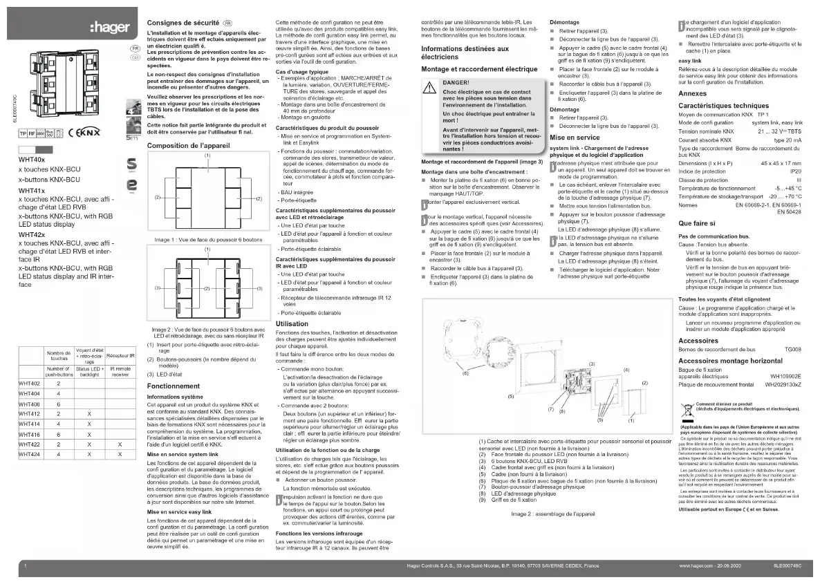 6LE000749CHager Controls S.A.S., 33 rue Saint-Nicolas, B.P. 10140, 67703 SAVERNE CEDEX, France www.hager.com - 20.09.2020 BN,.: M ` Consignes de sécurité a L'installation et le montage d'appareils élec- triques doivent être eff ectués uniquement par un électricien qualifi é. Les prescriptions de prévention contre les ac- cidents en vigueur dans le pays doivent être re- spectées. Le non-respect des consignes d'installation peut entraîner des dommages sur l'appareil, un incendie ou présenter d'autres dangers. Veuillez observer les prescriptions et les nor- mes en vigueur pour les circuits électriques TBTS lors de l’installation et de la pose des câbles. Cette notice fait partie intégrante du produit et doit être conservée par l‘utilisateur fi nal. Composition de l’appareil (2) (2) (1) Image 1 : Vue de face du poussoir 6 boutons (3) (3) (1) (2) Image 2 : Vue de face du poussoir 6 boutons avec LED et rétroéclairage, avec ou sans récepteur IR (1) Insert pour porte-étiquette avec rétro-éclai- rage (2) Boutons-poussoirs (le nombre dépend du modèle) (3) LED d'état Fonctionnement Informations système Cet appareil est un produit du système KNX et est conforme au standard KNX. Des connais- sances spécialisées détaillées dispensées par le biais de formations KNX sont nécessaires pour la compréhension du système. La programmation, l'installation et la mise en service s'eff ectuent à l'aide d'un logiciel certifi é KNX. Mise en service system link Les fonctions de cet appareil dépendent de la confi guration et du paramétrage. Le logiciel d'application est disponible dans la base de données produits. La base de données produit, les descriptions techniques, les programmes de conversion ainsi que d'autres logiciels d'assistance à jour sont disponibles sur notre site Internet. Mise en service easy link Les fonctions de cet appareil dépendent de la confi guration et du paramétrage. La confi guration peut être réalisée par un outil de confi guration dédié qui permet un paramétrage et une mise en œuvre simplifi és. Cette méthode de confi guration ne peut être utilisée qu'avec des produits compatibles easy link. La méthode de confi guration easy link permet, au travers d'une interface graphique, une mise en œuvre simplifi ée. Ainsi, des fonctions de bases pré-confi gurées sont aff ectées aux entrées et aux sorties via l'outil de confi guration. Cas d’usage typique - Exemples d’application ; MARCHE/ARRÊT de la lumière, variation, OUVERTURE/FERME- TURE des stores, sauvegarde et appel des scénarios d‘éclairage etc. - Montage dans une boîte d'encastrement de 40 mm de profondeur - Montage en goulotte Caractéristiques du produit du poussoir - Mise en service et programmation en System- link et Easylink - Fonctions du poussoir : commutation/variation, commande des stores, transmetteur de valeur, appel de scènes, détermination du mode de fonctionnement du chauff age, commande for- cée, commutateur à plots et fonction compara- teur - BAU intégrée - Porte-étiquette Caractéristiques supplémentaires du poussoir avec LED et rétroéclairage - Une LED d'état par touche - LED d'état pour l'appareil à fonction et couleur paramétrables - Porte-étiquette éclairable Caractéristiques supplémentaires du poussoir IR avec LED - Une LED d'état par touche - LED d'état pour l'appareil à fonction et couleur paramétrables - Récepteur de télecommande infrarouge IR 12 voies - Porte-étiquette éclairable Utilisation Fonctions des touches, l’activation et désactivation des charges peuvent être ajustés individuellement pour chaque appareil. Il faut faire la diff érence entre les deux modes de commande : - Commande mono bouton: L'activation/la désactivation de l'éclairage ou la variation (plus clair/plus foncé) par ex. s'eff ectue par alternance en appuyant successi- vement sur la touche. - Commande avec 2 boutons: Deux boutons (un supérieur et un inférieur) for- ment une paire fonctionnelle. Effl eurer la partie supérieure pour allumer/régler un éclairage plus clair ; effl eurer la partie inférieure pour éteindre/ régler un éclairage plus sombre. Utilisation de la fonction ou de la charge L'utilisation de charges tels que l'éclairage, les stores, etc. s'eff ectue grâce aux boutons poussoirs et dépend de la programmation de l' appareil. Actionner un bouton poussoir. La fonction mémorisée est exécutée. L'impulsion activant la fonction ne dure que le temps de l'appui sur le bouton.Selon les fonctions, un appui court ou prolongé peut provoquer des actions diff érentes, comme par ex. commuter/varier la luminosité. Fonctions les versions infrarouge Les versions infrarouge sont équipée d'un récep- teur infrarouge IR à 12 canaux. Ils peuvent être