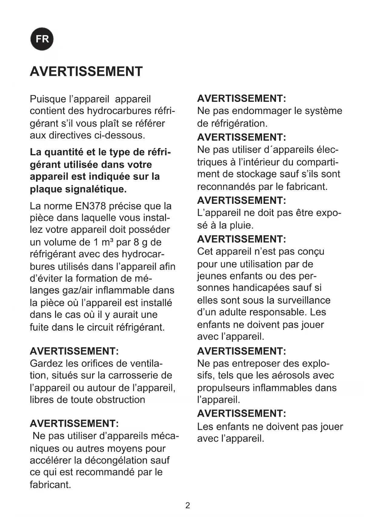 GBAVERTISSEMENT Puisque l’appareil appareil contient des hydrocarbures réfri- gérant s’il vous plaît se référer aux directives ci-dessous. La quantité et le type de réfri- gérant utilisée dans votre appareil est indiquée sur la plaque signalétique. La norme EN378 précise que la pièce dans laquelle vous instal- lez votre appareil doit posséder un volume de 1 m³ par 8 g de réfrigérant avec des hydrocar- bures utilisés dans l’appareil an d’éviter la formation de mé- langes gaz/air inammable dans la pièce où l’appareil est installé dans le cas où il y aurait une fuite dans le circuit réfrigérant.