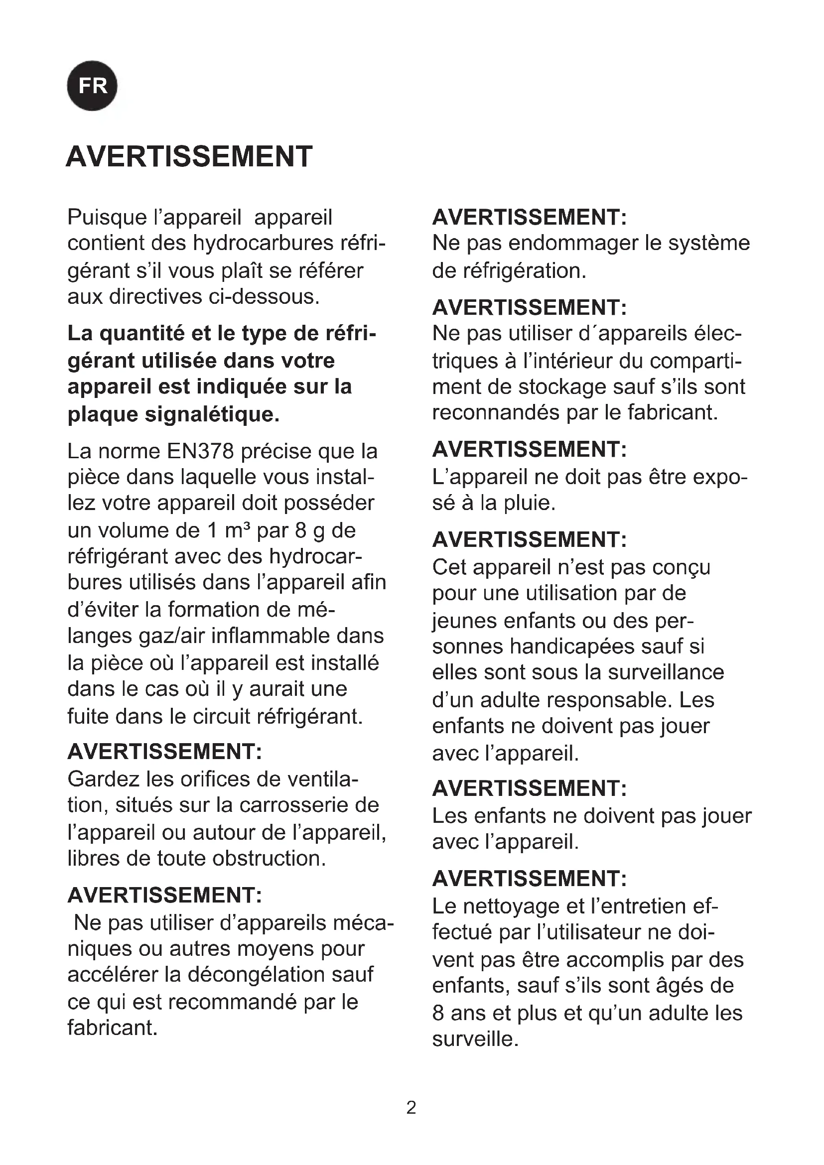 GBAVERTISSEMENT Puisque l’appareil appareil contient des hydrocarbures réfri- gérant s’il vous plaît se référer aux directives ci-dessous. La quantité et le type de réfri- gérant utilisée dans votre appareil est indiquée sur la plaque signalétique. La norme EN378 précise que la pièce dans laquelle vous instal- lez votre appareil doit posséder un volume de 1 m³ par 8 g de réfrigérant avec des hydrocar- bures utilisés dans l’appareil an d’éviter la formation de mé- langes gaz/air inammable dans la pièce où l’appareil est installé dans le cas où il y aurait une fuite dans le circuit réfrigérant.