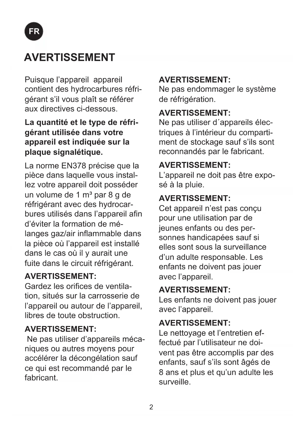 Le nettoyage et l’entretien ef- fectué par l’utilisateur ne doi- vent pas être accomplis par des enfants, sauf s’ils sont âgés de 8 ans et plus et qu’un adulte les surveille.
