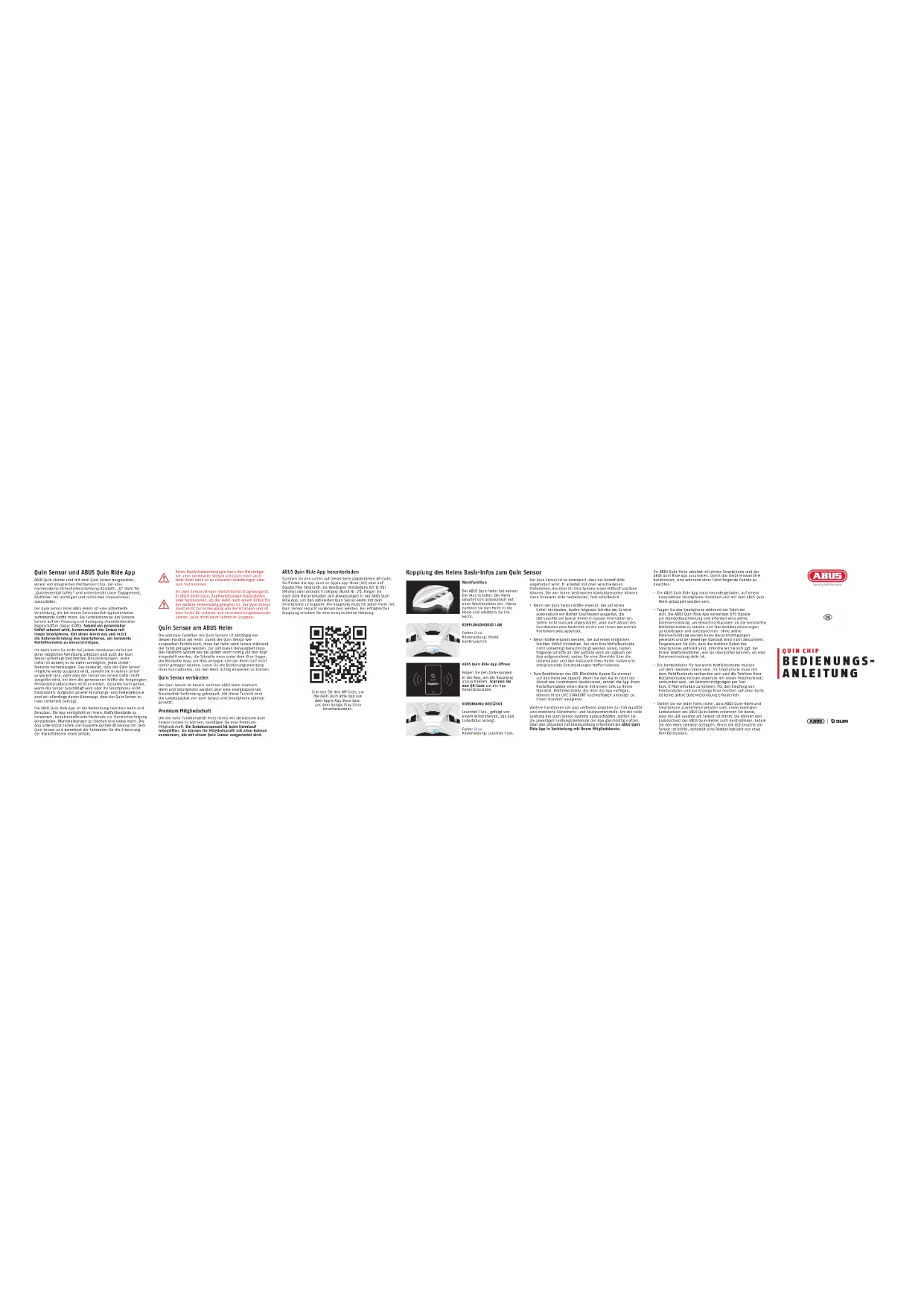 © ABUS 2020 ABUS August Bremicker Söhne KG | D 58292 Wetter | Germany. Tel.: +49 (0) 23 35 63 40 | www.abus.com | info@abus.de IP44 Link to this manualQuin Sensor et Appli ABUS Quin Ride Quin Sensor sur votre casque ABUS Coupler votre casque Bases du Quin Sensor Connecter le Quin Sensor Télécharger l’application ABUS Quin Ride Abonnement Premium Les casques ABUS Quin sont équipés de Quin Sensor, une puce multi-capteurs entièrement intégrée qui vous permet de proter des éléments essentiels de la sécurité moderne. « Q » est synonyme de « Quintessential Safety » et représente notre engagement pour apporter les innovations les plus essentielles et les plus utiles aux cyclistes. Le Quin Sensor équipé sur votre casque ABUS est un appareil breveté contenant des capteurs conçus pour mesurer les forces qui se produisent généralement lors d’un accident de vélo. Il fonctionne en mesurant et en interprétant les caractéristiques uniques de ces forces. Une fois qu’un accident potentiel est détecté, le capteur communique avec votre smartphone pour déclencher une alerte et utiliser la connexion de données du téléphone afin d’avertir vos contacts d’urgence configurés. Tout comme votre casque ne protège pas contre toutes les blessures possibles dans tous les types d’accidents, le Quin Sensor a ses propres limites. Chaque accident est diérent, et il est impossible de prévoir tous les scénarios de collision. Cela signie que le Quin Sensor peut être déclenché lorsque vous n’êtes pas impliqué dans un accident réel ou peut ne pas être déclenché lors de certains accidents où les forces mesurées n’atteignent pas les caractéristiques minimales établies. Il en va de même si vous endommagez le capteur ou si votre téléphone a planté. Cependant, sur la base de nos recherches et de nos tests, nous pensons qu’il vaut mieux un Quin Sensor activé que non. L’application ABUS Quin Ride est la liaison entre le casque et l’utilisateur. L’application vous permet de sélectionner vos contacts d’urgence, d’accéder à des fonctions de suivi de position personnalisées, d’annuler des alertes, etc. L’application est également responsable du protocole de double authentication du Quin Sensor et du traitement des données de trajet qui font partie intégrante de la détection des facteurs de risque d’un accident. Le Quin Sensor est conçu pour demander de l’aide lorsque vous en avez le plus besoin, et dispose de deux protocoles distincts qui peuvent déclencher un appel à l’aide via l’utilisation de votre smartphone. Votre ou vos contacts congurés peuvent alors avertir les secours si nécessaire.