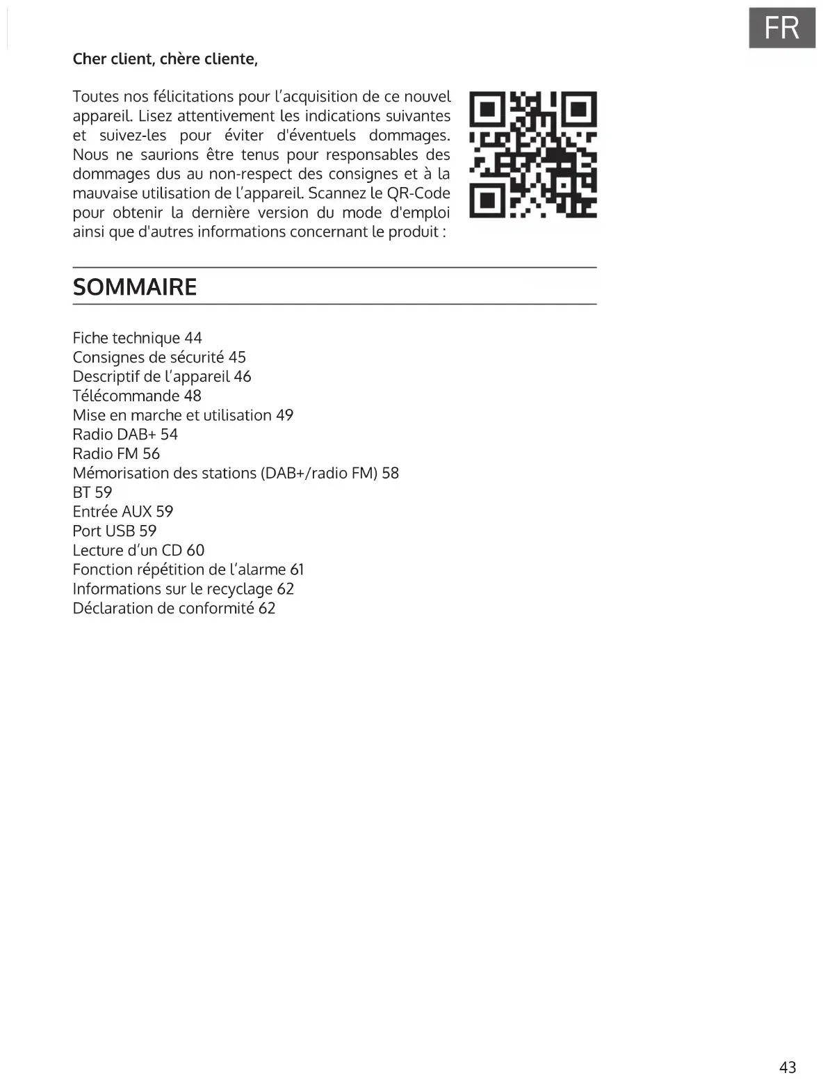 Cher client, chère cliente, Toutes nos félicitations pour l’acquisition de ce nouvel appareil. Lisez attentivement les indications suivantes et suivez-les pour éviter d'éventuels dommages. Nous ne saurions être tenus pour responsables des dommages dus au non-respect des consignes et à la mauvaise utilisation de l’appareil. Scannez le QR-Code pour obtenir la dernière version du mode d'emploi ainsi que d'autres informations concernant le produit : SOMMAIRE Fiche technique 44 Consignes de sécurité 45 Descriptif de l’appareil 46 Télécommande 48 Mise en marche et utilisation 49 Radio DAB+ 54 Radio FM 56 Mémorisation des stations (DAB+/radio FM) 58 BT 59 Entrée AUX 59 Port USB 59 Lecture d’un CD 60 Fonction répétition de l’alarme 61 Informations sur le recyclage 62 Déclaration de conformité 6244
