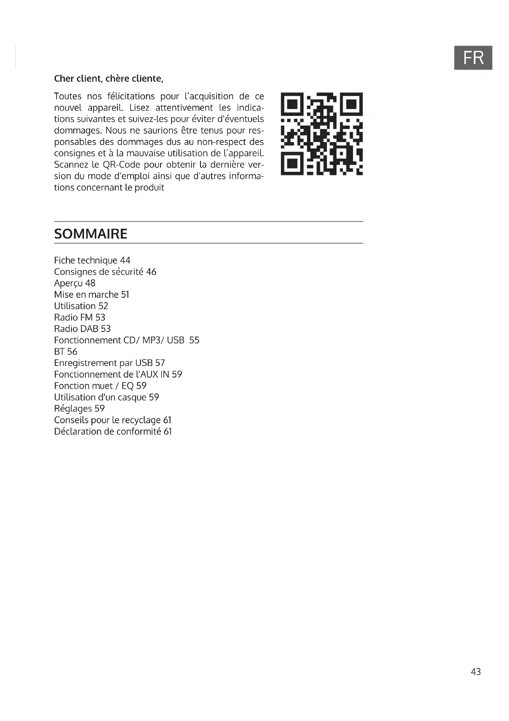 SOMMAIRE Fiche technique 44 Consignes de sécurité 46 Aperçu 48 Mise en marche 51 Utilisation 52 Radio FM 53 Radio DAB 53 Fonctionnement CD/ MP3/ USB 55 BT 56 Enregistrement par USB 57 Fonctionnement de l'AUX IN 59 Fonction muet / EQ 59 Utilisation d'un casque 59 Réglages 59 Conseils pour le recyclage 61 Déclaration de conformité 61 Cher client, chère cliente, Toutes nos félicitations pour l’acquisition de ce nouvel appareil. Lisez attentivement les indica- tions suivantes et suivez-les pour éviter d'éventuels dommages. Nous ne saurions être tenus pour res- ponsables des dommages dus au non-respect des consignes et à la mauvaise utilisation de l’appareil. Scannez le QR-Code pour obtenir la dernière ver- sion du mode d'emploi ainsi que d'autres informa- tions concernant le produit44