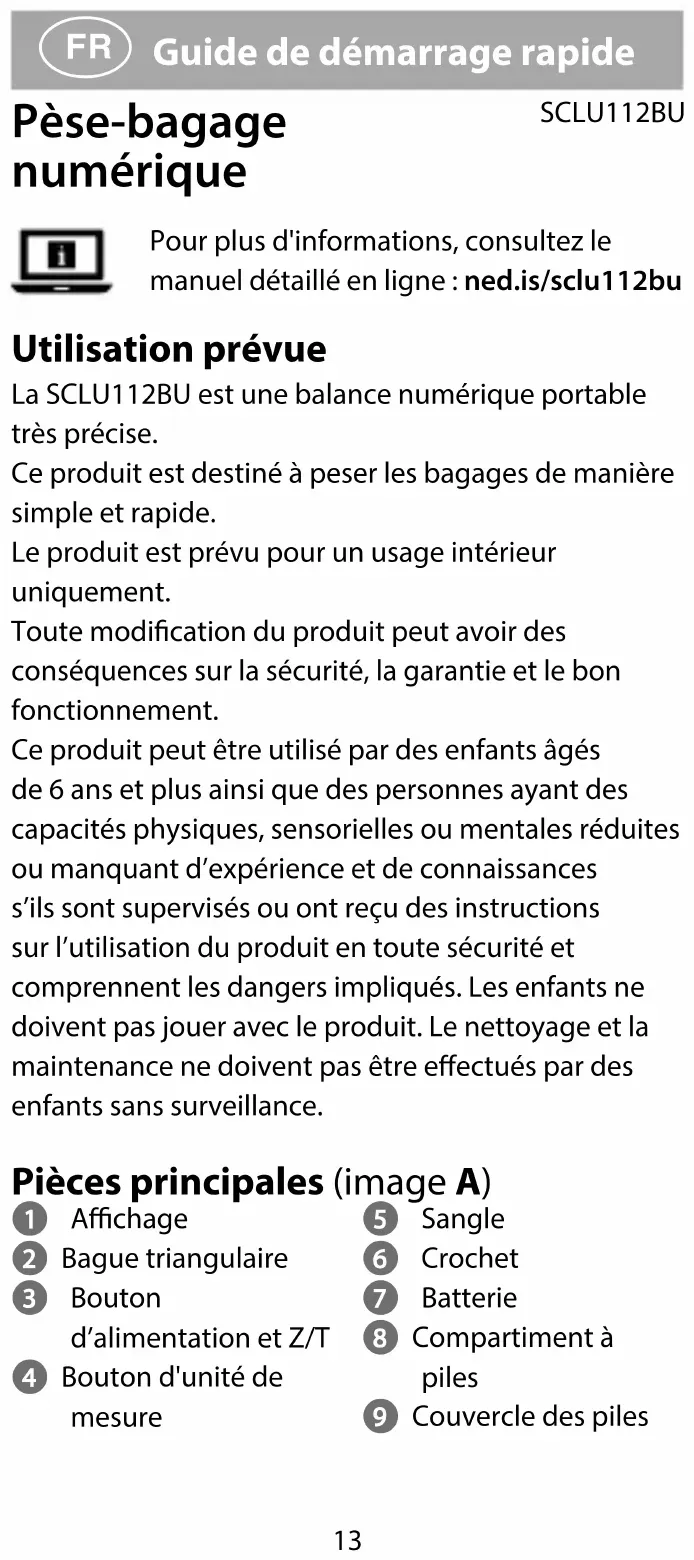 Guide de démarrage rapide Pèse-bagage numérique SCLU112BU Pour plus d'informations, consultez le manuel détaillé en ligne : ned.is/sclu112bu Utilisation prévue La SCLU112BU est une balance numérique portable très précise. Ce produit est destiné à peser les bagages de manière simple et rapide. Le produit est prévu pour un usage intérieur uniquement. Toute modication du produit peut avoir des conséquences sur la sécurité, la garantie et le bon fonctionnement. Ce produit peut être utilisé par des enfants âgés de 6 ans et plus ainsi que des personnes ayant des capacités physiques, sensorielles ou mentales réduites ou manquant d’expérience et de connaissances s’ils sont supervisés ou ont reçu des instructions sur l’utilisation du produit en toute sécurité et comprennent les dangers impliqués. Les enfants ne doivent pas jouer avec le produit. Le nettoyage et la maintenance ne doivent pas être eectués par des enfants sans surveillance. Pièces principales (image A) 1 Achage 2 Bague triangulaire 3 Bouton d’alimentation et Z/T 4 Bouton d'unité de mesure 5 Sangle 6 Crochet 7 Batterie 8 Compartiment à piles 9 Couvercle des piles14 Consignes de sécurité